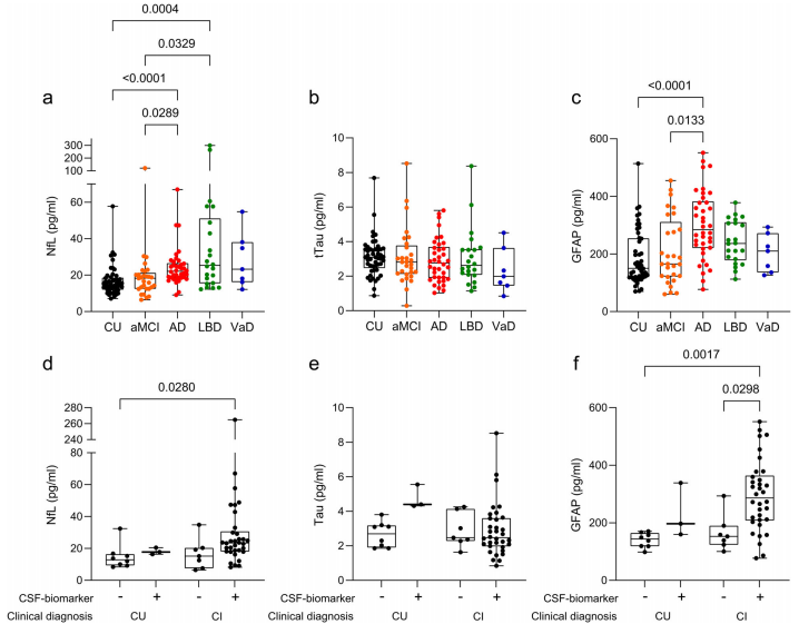 结果显示,与CU对照组相比,AD和LBD组的血浆NfL显著升高。与aMCI组相比,AD和LBD组患者的NfL也有显著性增加。CU和aMCI之间没有统计学上的显著差异(图a)。在任何诊断组中,血浆tTau水平均未发生显著改变(图b)。与CU或aMCI组相比,AD组GFAP显著升高 (图 c)。对于NfL和GFAP,VaD组和CU组之间没有统计学上的显著差异。
