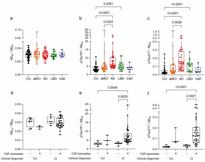 血浆Aβ42 / Aβ40已被认为是淀粉样变性的标志物,在此次研究中,临床定义的不同组别血浆Aβ42 / Aβ40比值没有相关变化(图a)。AD患者的pTau181 / Aβ42比值明显高于CU和aMCI组;与CU相比,LBD参与者的pTau181 / Aβ42比值也有所增加 (图b)。pTau217 / Aβ42比值在这三个比较中同样显著升高(CU x AD,;aMCI x AD;CU x LBD),且有更高的倍数变化(图c)。