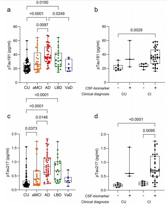 临床诊断为AD的参与者与CU、 aMCI 或VaD组相比,pTau181水平均显著升高,(图a)。与CU对照组相比,LBD组中pTau181的表达也有所增加(图a)。CSF阳性CI参与者的血浆pTau181水平显著高于CSF阴性CU对照组(图b)。