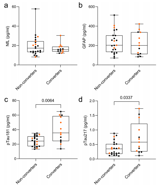 作者评估了血浆NfL、GFAP、pTau181和pTau217在预测诊断转变中的作用。血浆NfL或GFAP在转变者和非转变者两组间无显著差异(图a, b)。然而,基线血浆pTau181 和pTau217 在随访期间诊断转变者中均升高(图c, d)。