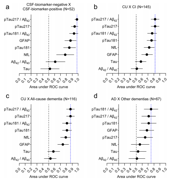 ROC曲线分析结果显示,pTau217 / Aβ42比值是区分CSF -阴性和阳性受试者的最佳生物标志物(AUC = 0.98) (图a)。根据参与者的认知状态(CU x CI),pTau217和pTau217 / Aβ42比率也是表现最好的,AUC均达到0.82 (图b)。区分CU和全因痴呆时也是类似的结果。只有在区分AD和其他痴呆时,pTau181 / Aβ42的比值达到最高AUC 0.75 (图d)。血浆tTau和Aβ42 / Aβ40在各种分析中表现均不佳(图d)。