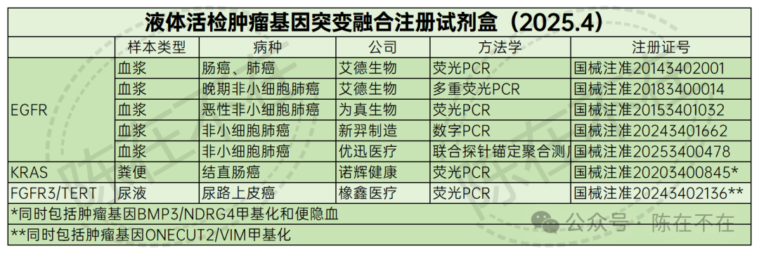 主要是EGFR基因突变试剂盒。 还有两个是与基因甲基化联合检测。 艾德生物拥有第一个肿瘤荧光PCR液体活检注册试剂盒,其2019年获得的二代测序BRCA1/2试剂盒被认为实际检测的是白细胞胚系突变。新羿制造则获得数字PCR肿瘤突变液体活检首证。第一个肿瘤NGS液体活检注册试剂盒花归优讯医疗。 肿瘤基因甲基化 截止到2025年4月,基因甲基化获证38个,其中:37个与肿瘤相关;1个为系统性红斑狼疮。肿瘤基因甲基化试剂盒中:1个样本为石蜡切片,6个为宫颈脱落细胞,其余30个液体活检试剂盒见下表绿色部分。 microRNA microRNA(miRNA)是一类内生的、长度约 20 - 24 个核苷酸的非编码单链 RNA 分子。 截止到2024年12月,microRNA获证试剂盒3个,均为PCR法,见下表。 循环肿瘤细胞 循环肿瘤细胞(CTCs)是一群被认为从原发性肿瘤或转移性肿瘤部位脱离,并在血液中循环的肿瘤细胞。由于它们是完整的活细胞,在循环系统中具有较长的半衰期,并且提供了一些无法通过 ctDNA 分析获得的参数,包括 RNA 和蛋白质分析以及完整的基因组。 捕获 CTCs 进行分析存在重大挑战。CTCs 是罕见事件,即使在转移性癌症患者中,也并不总是存在于外周血中。即使存在,其浓度也非常低,处于每十亿个红细胞和数百万个白细胞中只有一个 CTC 的范围。CTC 标志物可能与原发性肿瘤细胞的标志物不同,并且在治疗过程中也可能发生变化,这使得它们难以靶向定位。 根据《2023年第三次医疗器械产品分类界定结果汇总》,以下建议按第三类医疗器械管理: (四十七)血液循环肿瘤细胞自动分选仪:由精密加样系统(由传输系统、清洗系统、温育系统、混匀系统、软件系统组成)和分选系统(由磁珠吸附模块、样品和磁珠混匀模块、离心模块、照明和UV消毒模块组成)组成。与荧光原位杂交样品处理试剂盒配合使用,用于循环肿瘤细胞的富集,经提取后的细胞用于后续染色计数或其它靶标物质检测。分类编码:22-10。 外囊泡 目前,肿瘤外泌体获证试剂盒仅思路迪一家。通过体外测定人血清外泌体中的CA125、HE4和C5a浓度,并经给定的计算公式计算卵巢癌评分OCS(ovarian cancer score) ,适用于临床上发现有附件包块的女性患者,辅助诊断上皮性卵巢癌。 以上为肿瘤液体活检NMPA注册产品。NIPT及生殖健康,器官移植等方面的液体活检产品未在此列。 液体活检作为一种新兴的肿瘤检测技术,具有无创、可重复等优点,但在临床应用和推广过程中仍面临着诸多挑战: