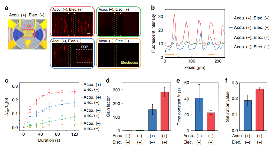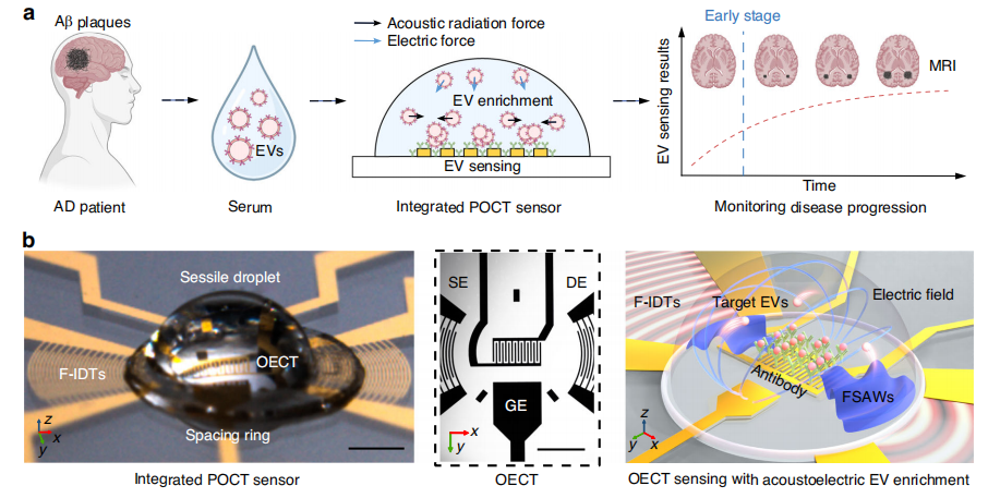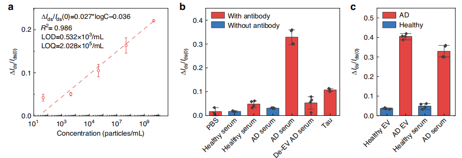 POCT传感器由基于OECT的传感单元和声电EV富集单元组成(图b)。在间隔环(spacing ring)中加入患者血清样本或EV样本,细胞外囊泡可以在聚焦式声表面波与电脉冲作用下主动富集到传感区域。然后,携带Aβ和tau等膜蛋白的靶EV可以被包被在传感区域的相关抗体选择性捕获。一旦目标EV与传感区域结合,OECT传感器可以传感AD患者血液中目标EV的数量(图a)。