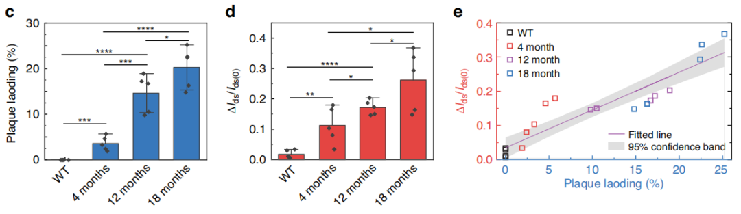 作者研究了在5xFAD小鼠模型中应用此传感器监测AD进展的可行性。5xFAD小鼠过表达人类AD相关突变,包括APP和PSEN1。5xFAD小鼠在不同年龄组(4、12和18个月)进行MRI以及EV检测,血清样品稀释后使用抗Aβ42修饰的传感器芯片进行检测。结果显示,在整个病理进展过程中,MRI测定出的Aβ负荷(图 c)与传感器检测到的Aβ42 + EV(图d)均显著增高。且集成传感器与MRI斑块负荷相关性良好,Pearson r = 0.920(图e),这表明集成传感器可能是监测AD过程的有效替代工具。