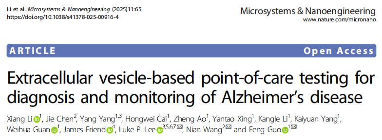 近日,杂志Microsystems & Nanoengineering上发表了一篇题为“Extracellular vesicle-based point-of-care testing for diagnosis and monitoring of Alzheimer’s disease”的文章。作者开发了一种集成POCT传感器,可以检测AD患者的血清EVs,检测限低至500 EV颗粒/mL,检测时间缩短至仅2分钟。该集成POCT传感器用于监测AD小鼠模型的AD进展,在整个病理进展过程中,检测结果与MRI斑块负荷相关性良好,Pearson r = 0.920。超快的检测速度是该设备的一个关键特点,可以在2分钟内达到饱和,显示了OECT传感的重大突破。这项概念验证研究表明,此集成POCT传感系统可以应用于AD的快速微创诊断和预后。