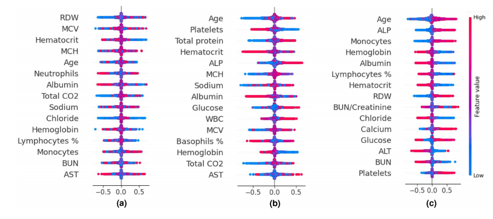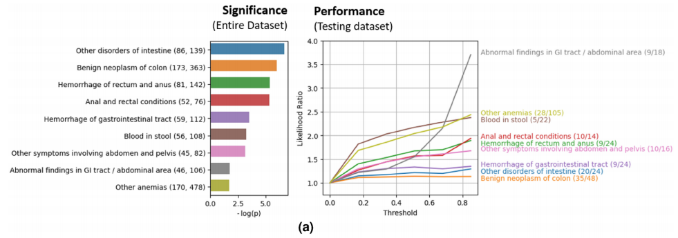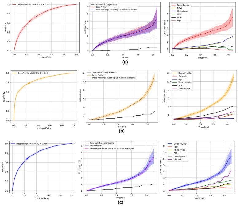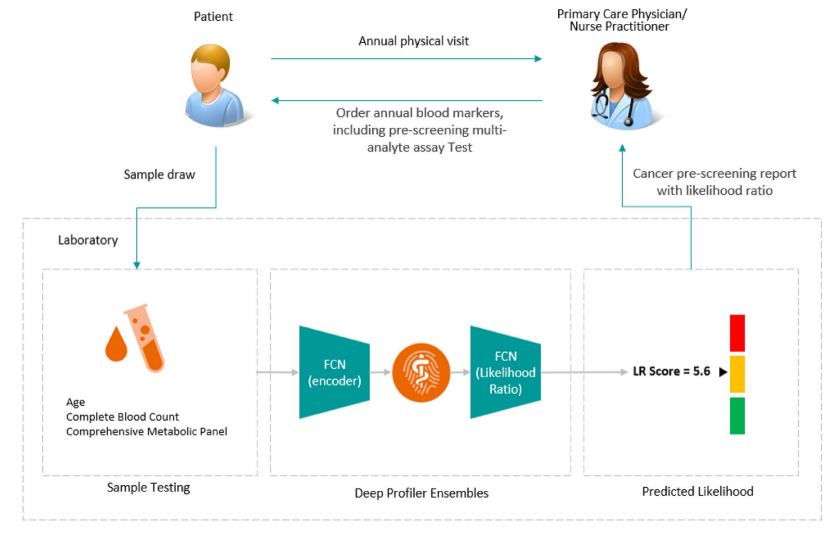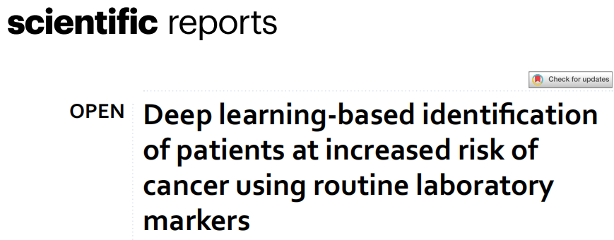癌症是全球主要死因之一,癌症的早期筛查可以提高生存率,并使患者免于因诊断晚而进行密集和昂贵的治疗。然而,现有筛查方法(如结肠镜、低剂量CT)存在侵入性高、成本昂贵、依从性低等问题。可在健康人群中进行初步的风险分层步骤,以确定筛查方法和频率,主要是通过针对最受益的个体进行筛查来优化资源分配。最近也提出了更方便的风险评估方法,比如四标记蛋白panel(4MP),Pro-SFTPB,CA-125,CEA和CYFRA 21-1,已与PLCOm2012多风险预测模型(评估年龄、吸烟史、种族、体重指数、教育程度、家族史等)联合用于预测肺癌风险。然而,常规血液检测不包含所需的生物标志物,这对该检测的临床应用提出了挑战。 近日,杂志scientific reports上发表了一篇题为“Deep learning-based identification of patients at increased risk of cancer using routine laboratory markers”的文章。作者通过训练深度学习模型deep Profiler来解决上述挑战,该模型采用CBC和综合代谢组(CMP)中包含的年龄、性别和通常获得的血液生物标志物,并输出患者在接下来的12个月内患癌症的可能性比。作者证明了简单、广泛可用的血液检查的组合,如全血细胞计数和完全代谢组,可以潜在地用于识别具有结肠癌、肝癌和肺癌风险的患者,ROC曲线下的面积分别为0.76、0.85和0.78。这种方法不仅可以用作个人的预筛查风险评估,还可以用作人群健康管理工具。 图片来源:scientific reports 工作流程概述 作者训练了一个名为Deep Profiler的深度学习模型,该模型以患者的年龄、性别,以及血常规(CBC)和综合代谢panel(CMP)中常规检测的血液生物标志物作为输入,输出患者在接下来12个月内罹患癌症的似然比(Likelihood Ratio)(见下图)。Deep Profiler的架构采用VAE (variational autoencoder)模型,从共享的编码潜空间训练特定癌症风险预测模型,并计算每位患者的似然比。最终,作者通过对结直肠癌、肝癌和肺癌的筛查相关队列的研究,验证了此方法的有效性。用于模型开发的队列包括近10,000名未诊断出癌症的患者,以及293名、626名和683名患结直肠癌、肝癌或肺癌的患者;而验证队列分别包括近5000名未诊断出癌症的患者,以及94名、189名和224名患结直肠癌、肝癌或肺癌的患者。 使用基于生物标志物的预筛选测试的工作流程。 图片来源:scientific reports Deep Profiler 预估三种癌症类型的癌症风险 作者训练Deep Profiler来预估三种癌症类型的癌症风险:结直肠癌、肝癌和肺癌。给定生物标志物值,该模型为每种癌症类型输出一系列风险评分,计算似然比(LR)。下图显示了结直肠癌、肝癌和肺癌风险阈值增加时的LRs以及受试者工作特征(ROC)曲线。以总超参考范围(OoR)标记物为指标的模型,癌症的可能性随着总OoR标记物的增加而增加。然而,与Deep Profiler模型相比,增幅明显较低。以年龄作为单一指标的LR曲线相比,Deep Profiler提供的LR的增加幅度也要高得多。 总体而言,与CRC和肺癌Deep Profiler模型相比,肝脏特异性Deep Profiler模型表现明显更好。在CRC验证队列中,模型的AUC为0.78,对于肝癌和肺癌验证队列,74岁以下患者的AUC分别为0.85和0.81。 对三种癌症队列进行定量性能评估。 图片来源:scientific reports 癌症类型的相关生物标志物 为了深入了解对LR影响最大的实验室标志物,作者进行了SHAP分析,列出了对结直肠癌、肝癌和肺癌模型LR影响最大的前15个实验室标志物。 3个标志物(年龄、白蛋白和红细胞压积)在所有癌症类型中是共享的,其中年龄在3种癌症类型中均为前五最关键标志物。在任何两种癌症类型中至少有7个标记是共享的。一种(中性粒细胞),三种(总蛋白,白细胞和嗜碱性粒细胞(%))和三种(尿素氮-肌酐比率,钙和ALT)标志物分别仅在结直肠癌,肝癌和肺癌中最重要。 SHAP显示了15种对LR影响最大的标志物的贡献。 图片来源:scientific reports 模型在患有合并症的患者亚组上 显示出了识别高危患者的附加价值 对于每个癌症队列,作者使用phecodes来识别在癌症诊断之前存在的合并症。结果发现,在结直肠癌队列中,诊断前的三大显著合并症是肠道紊乱、结肠的良性肿瘤以及直肠和肛门出血。当使用粪便中有血的患者亚组作为替代,与基础患病率相比,LR增加了三倍以上,风险阈值大于0.8(下图a)。此外,在有直肠、肛门或胃肠道出血等情况的患者亚组中也有附加价值。对于肺癌,当模型在烟草成瘾患者亚组中时,模型显示了识别高危患者的附加价值,与基础患病率相比,LR增加了50%以上,风险阈值大于0.9(下图C)。 模型在患有合并症的患者亚组上的似然比。 图片来源:scientific reports 总结与讨论 作者报告了三种癌症类型基于常规实验室标志物的风险预测模型的开发和评估。在本文中,作者开发了一种基于血液标志物的风险分层方法,该方法可用于识别癌症风险升高的患者,以进一步进行诊断测试或参与筛查计划。作者证明了简单的血液检查的组合,如全血细胞计数和完全代谢组,可以潜在地用于识别具有结肠癌、肝癌和肺癌风险的患者,ROC曲线下的面积分别为0.76、0.85和0.78。这种方法不仅可以用作个人的预筛查风险评估,还可以用作人群健康管理工具,例如更好地询问某些亚人群的癌症风险。 |