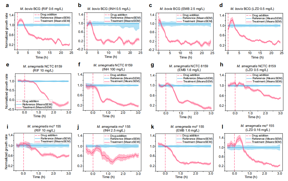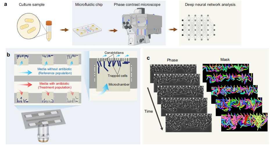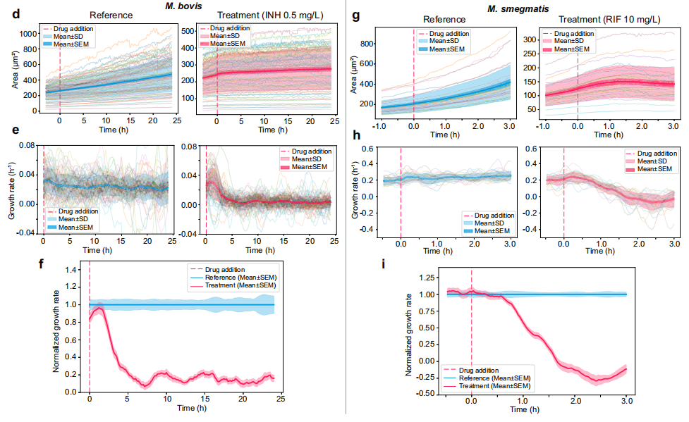 结核病(TB) 是一种由结核分枝杆菌(Mtb)引起的传染病,至今仍是全球公共卫生的重大威胁。2023年,估计有1080万人感染结核病,同年,共有125万人死于该病。药物耐药性结核病(DR-TB)的蔓延更是加剧了这一局势,尤其是耐多药结核病(MDR-TB)和广泛耐药结核病(XDR-TB)的出现,使得治疗变得更加复杂和昂贵。因此,快速、准确地检测结核分枝杆菌的药物敏感性对于指导临床治疗、防止耐药性的传播至关重要。 目前,结核分枝杆菌的药物敏感性检测主要分为基因型检测(gDST)和表型检测(pDST)两种方法。gDST在实验应用中得出结果的时间从1到10个工作日不等,且可能无法检测到所有耐药机制。pDST表型检测通过观察细菌在含药培养基中的生长情况来判断其耐药性,被认为是金标准,但耗时较长,通常需要两周以上。 近日,杂志Nature communications上发表了一篇题为“Phenotypic drug susceptibility testing for Mycobacterium tuberculosis variant bovis BCG in 12 hours”的文章。在这项研究中,作者提出了一种快速pDST方法,结合微流体、单细胞成像和基于深度神经网络(DNN)的图像分析,可以在3 h内可靠地分离出耐药和敏感耻垢分枝杆菌菌株。这种pDST方法旨在帮助降低诊断性TAT,实现更快的DST,可以支持更有效的药物反应监测,使患者受益。 图片来源:Nature communications 主要内容 01 基于微流控芯片的 快速表型药敏试验(pDST)原理 基于微流控芯片的快速表型药敏试验(pDST)工作流程如下图所示。液体培养中的细胞被装入微流体装置,在微室中进行分隔。微流控芯片有两排微室作为细胞陷阱;每排有100个尺寸为50 × 60 × 1µm的微室。一旦细胞被装入微室,就会被相差显微镜连续动态观测,监测不同抗生素暴露条件下微室中细胞的生长情况(图c)。得到的图像数据用基于深度神经网络(DNN)的方法进行分析。 快速pDST工作流程的示意图 图片来源:Nature communications 02 结核和非结核病原体的快速pDST 作者使用牛分枝杆菌卡介苗和耻垢分枝杆菌作为结核和非结核病原体的代表,在微流控芯片内观察其总细胞面积扩张,这种总面积扩张是由于细胞在微室内的生长。未经治疗的对照组(左)和异烟肼治疗组(右)的牛分枝杆菌卡介苗总面积随时间的变化有显著差异(图d),治疗组归一化后的生长速率显著偏低(图f)。同样,耻垢分枝杆菌对照组菌群(左)的生长速率与药物处理组菌群(右)相比,也显著升高(图i)。 两种分枝杆菌快速pDST的结果 图片来源:Nature communications 03 快速检测药物治疗反应 作者使用快速pDST测定牛分枝杆菌卡介苗和耻垢分枝杆菌在利福平(RIF)、异烟肼(INH)、乙胺丁醇(EMB)或者利奈唑胺(LZD)存在条件下的生长速度。对于倍增时间为18-24小时的牛分枝杆菌,可以在3小时内检测到药物处理组和对照组之间的生长速率差异(图a-d)。对于快速生长的耻垢分枝杆菌,在1小时内可以检测到两个群体之间的生长速率差异(图e-l)。 快速检测药物治疗反应 图片来源:Nature communications 04 耐药菌株的检测 作者对RIF、INH和LZD耐药耻垢分枝杆菌菌株进行了pDST,并将耐药菌株的pDST谱与敏感亲本菌株进行比较。耻垢芽孢杆菌RIF E1 ~ E3的pDST结果显示,RIF E1和E2菌株对RIF高度耐药;RIF E3抗性相对较弱(图c)。对于INH耐药菌株,INH E1表现出高耐药性(图d);INH E2和INH E3在加药后的前30min内生长速率下降,3h后逐渐恢复到参考水平(图e, f)。3株LZD耐药菌株均显示对LZD抗性较高(图i)。总体而言,利用快速pDST法可以在3 h内可靠地分离出耐药和敏感耻垢分枝杆菌菌株。 耐药菌株的检测 图片来源:Nature communications 总结与讨论 作者发现,基于生长的pDST可以在12小时内对缓慢生长的分枝杆菌进行快速鉴定。作者使用牛分枝杆菌卡介苗和耻垢分枝杆菌作为分枝杆菌病原体模型,并将它们暴露于利福平(RIF)、异烟肼(INH)、乙胺丁醇(EMB)、利奈唑胺(LZD),采用相差显微镜对微流控芯片中的细菌生长进行了连续动态观测。一种基于深度神经网络的分割算法被用来量化生长速度,并确定菌株对药物治疗的反应。总体而言,利用快速pDST法可以在3 h内可靠地分离出耐药和敏感耻垢分枝杆菌菌株。这种pDST方法旨在帮助降低诊断性TAT,实现更快的DST,并可能支持更有效的药物反应监测,这将使患者受益。此外,短试验TAT最大限度地减少了药敏试验期间产生的获得性耐药性。 该方法不仅显著缩短了检测时间,提高了检测效率,还有助于减少因长时间检测而导至的获得性耐药风险。然而,要将其应用于临床还需解决一系列问题,如优化样品制备流程、提高检测灵敏度、降低成本等。此外,对于高度毒力和耐药的结核分枝杆菌的临床样本检测也需进一步验证。 |