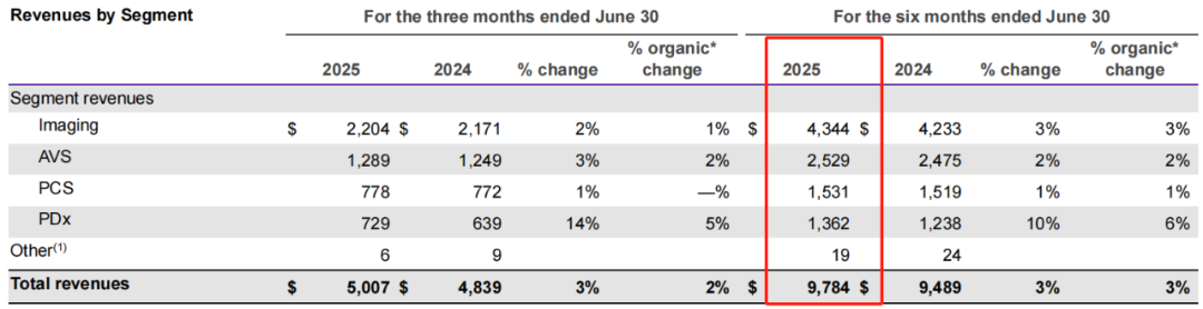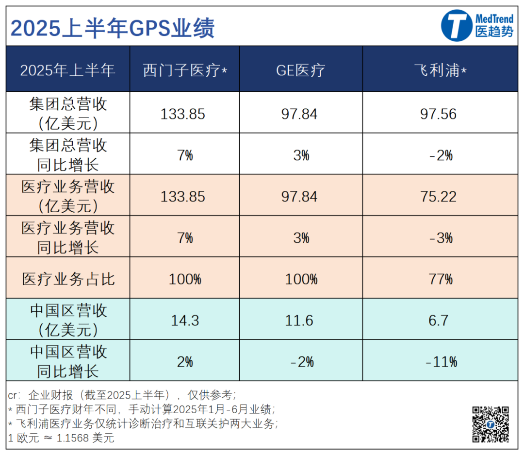 从区域来看, EMEA(包括欧盟、非洲、中东):营收36.41亿欧元,同比+2%。增长稳健,德国市场增长良好。 美洲区:营收51.69亿欧元,同比+11%。表现最强劲,美国市场作为西门子医疗第一大市场,营收45.11亿欧元,同比+14%。 亚太区含日本(不含中国):营收15.25亿欧元,同比+7%。受益于高端设备需求。 中国区(占比11%):营收12.35亿欧元,同比+2.4% 。增长主要依赖去年同期低基数;IVD受到集采执行影响。 ▐ GE医疗:中国市场回暖 GE医疗在2025年第二季度表现强劲,销售额高于华尔街预期。受健康的资本投资趋势、运营执行及关税税率变化影响,公司上调2025年指引,营收同比增长预期升至约3%。 2025上半年,集团营收97.84亿美元,同比增长3%。主要由服务收入增长驱动。 影像(占比44%):营收43.44亿美元,同比+3%。 *** 包括CT、MR、分子成像、X射线、女性健康、企业成像软件、服务和数字解决方案。