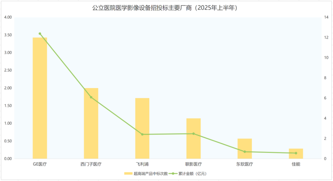 从区域来看, 美国(占比41%):飞利浦第一大市场,营收34.76亿欧元,同比-0.1%。 荷兰:营收11.26亿欧元,同比+2.1%。 中国(占比7%):营收5.79亿欧元,同比-11%。 日本:营收4.69亿欧元,同比+0.9%。 德国:营收2.97亿欧元,同比-2%。 其他国家:营收24.87亿欧元,同比-4.3%。 02 中国市场 短期挑战持续,长期潜力仍被巨头锁定 在经历了2024年的逆风之后,领先医学影像企业在中国市场的业绩有所回暖;然而,中国医疗市场的挑战依旧严峻。 西门子医疗表示,中国的集采政策引发了行业性的价格体系重构,改变了商业模式和分销角色,这对公司诊断业务的全球增长和利润率均产生了影响,但总体影响相对较小。 西门子医疗预计,中国集采导至的价格重构过程大约需要一年时间,预计到明年年中,全国市场价格水平将完成重构,届时增长将从新的较低起点逐步恢复。 针对中国限制欧盟医疗设备进口的消息,西门子医疗表示此政策对其业务并无实质性影响。主要原因一是公司大部分在华业务依托于本土化生产,二是政策设定的门槛(约500万欧元)极高,相关情况极为罕见。 尽管来自中国的逆风影响超出预期,但公司仍有信心实现年初设定的利润率扩张目标。 GE医疗表示,2025年第二季度中国市场积压订单改善情况良好超出预期;然而,公司对中国市场下半年的前景持谨慎态度。 尽管中国市场活动有所增加,但复苏进程较为缓慢,实际采购订单和购买行为的进展仍显滞后。省级招标周期延长,从投标到中标所需时间更长,预计下半年这一状况将持续存在。 2024年3月发布的中国医疗设备更新计划,从长期来看,这将有利于GE医疗在中国的业务发展;但短期内,由于各省制定计划和客户采购决策的进展慢于预期,将对订单和收入产生一定影响。 此外,在未来18至24个月内,GE医疗计划在全球范围内推出多款新产品,其中部分高端产品在中国市场将具有显著影响力。这些高端产品主要将通过独立渠道销售。 从长远来看,基于中国市场的规模和潜力,前景依然积极,中国市场仍是GE医疗重要的增长驱动力。 飞利浦表示,中国医疗设备市场的刺激措施和招标活动有所增加,但第二季度医疗设备业务增长仍较为缓慢。 诊断与治疗业务预计在下半年订单和销量将有所改善(环比提升),并逐步转为正增长。创新产品(如无氦MRI系统)在中国市场已获得一定程度的支持。 近期,飞利浦全球管理层到访中国,与客户和政府进行深入沟通,确认市场的长期潜力。 此外,美中双边贸易关税的预期低于此前的假设。而针对中国市场成本通胀问题,飞利浦通过优化供应链(如调整供应商网络)积极应对。 尽管飞利浦对中国市场2025年全年持谨慎态度,但长期来看,公司依然看好中国市场的前景。预计中国业务将逐步恢复至此前的中个位数增长水平,但这一进程较为缓慢。 03 中国医疗设备招投标 影像赛道领跑,头部技术竞逐 据医装数据统计分析来看,医学影像仍然是中国医疗设备市场中增速最快的细分领域,2025年1月至5月的整体同比增速超过100%。 从中国市场2025年上半年的医院中标情况来看,外资和民营企业呈现出多元竞争的态势。具体而言,与2024年相比(按中标金额计算),在DR领域,万东医疗跃居首位;在CT领域,西门子医疗升至榜首。 *** 数据来源:医招采、众成数科,(按中标金额) 2025年上半年,在医学影像和超声领域(按中标金额计算),市占率前三名合计占比分别为:DR约46%、CT约66%、MRI约72%、DSA约85%、超声约73%。除DR和超声市场外,其余各领域的市场集中度均有所下降。 而医学影像领域头部企业展开的新一轮技术较量,超高端产品似乎成为市场决胜的关键赛道。从2025年上半年超高端医疗设备项目的中标情况来看,GE医疗、西门子医疗、飞利浦位列前三。 *** 数据来自中国政府采购网,人工不完全统计,仅供参考 已历时一年多的医疗设备更新项目,也是各企业关注的焦点。据众成数科统计,2025年上半年,在中国医疗设备更新项目中,已披露预算金额的项目审批数量共计212个,总金额高达153.4亿元。在这些项目中,拟采购频率最高的五类产品依次为超声、CT、MR、DR和DSA。 从上半年已完成招标的项目来看,不乏数亿元级别的大项目,且多数由国产厂商中标。 短期挑战与长期潜力交织的中国医疗设备市场,正倒逼全球巨头以高端技术深耕破局、以本土化应变。影像等核心赛道的竞逐已进入深水区,而随着集采重构、招标落地与创新迭代的持续推进,万亿市场的新秩序,正在冰与火的碰撞中加速成型。 |