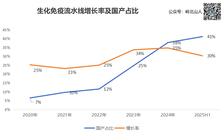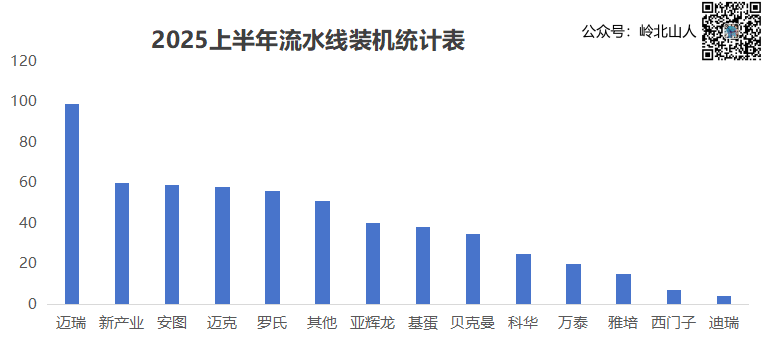 作者:岭北山人 本文共2000字,预计阅读时间3分钟 2024年国内流水线装机超过1200+条,其中迈瑞年度装机量首次超过罗氏,详见2024年流水线装机1200条。2025年已经过半,流水线市场保持持续强劲状态。 7月31日,迈克生物发布半年报,免疫线出库846台。其中,国内合计出库377台;海外合计469台。自主生化仪,基本全在国内,上半年61台。而大家最关注的流水线,也公布了详细数据:生免流水线151条,安装109条。存量累计安装接近500条。血球、血凝流水线出库107条,安装95条。存量累计安装接近600条。这是国内首份披露生化免疫流水线装机数据的半年报。小编根据上市公司年报及行业相关信息,进行了初步梳理,将2025年H1市场生化免疫流水线装机情况汇总。1、本文所有数据,均来源于市场调研,如有官方数据,以官方数据为准。本公众号不对数据的真实性负责;2、所有数据,均为生化免疫流水线(含完整样本前处理装置),不包含市面上的生化免疫一体机;3、所有数据,均为真实装机(录保修卡)数据,非厂家出库、招投标中标、合同等数据。