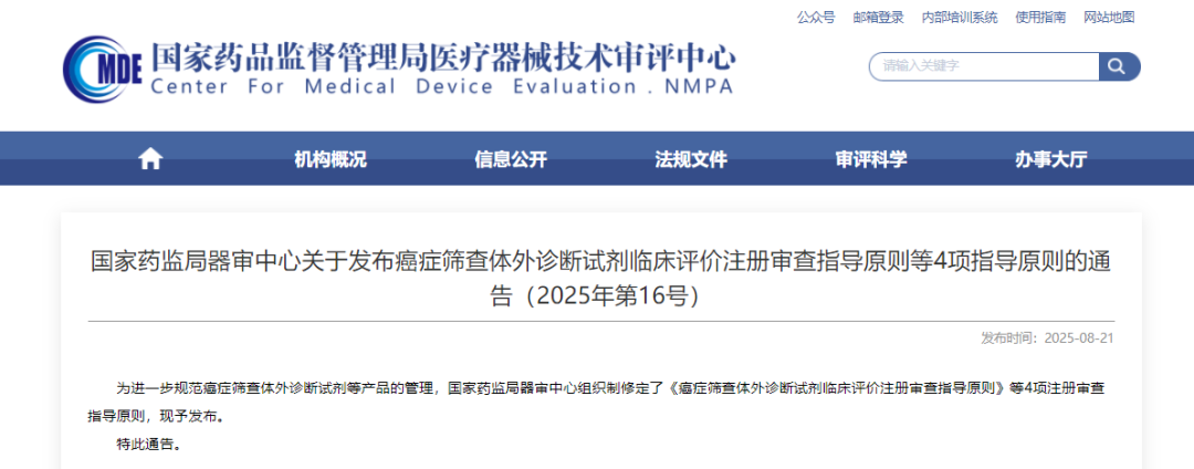 2025年8月21号,为进一步规范癌症筛查体外诊断试剂等产品的管理,国家药监局器审中心组织制修定了《癌症筛查体外诊断试剂临床评价注册审查指导原则》,现予发布。