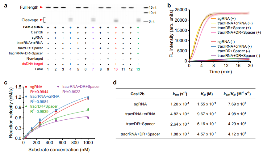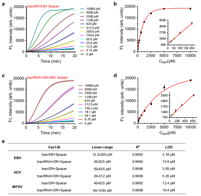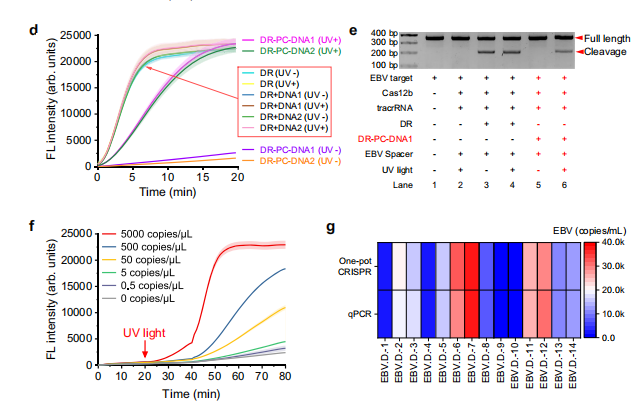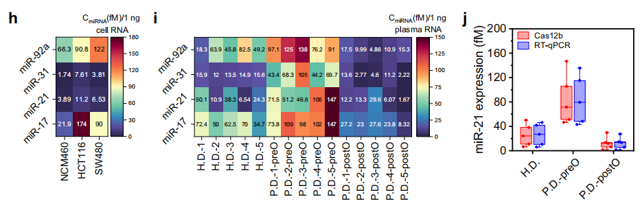 CRISPR-Cas12b系统在分子诊断领域展现出巨大潜力。与Cas9和Cas12a相比,Cas12b体积更小,更适合通过递送进行基因治疗。Cas12b耐受较宽的温度范围和PH,即使与人血浆在37°C下孵育12小时后,Cas12b仍保持着显著的活性。这些有利的特性使Cas12b成为基因编辑和突变检测中的关键角色。然而,与Cas12a相比,Cas12b仍有可以改进的地方。Cas12a只需要大约42 nt的crRNA就能有效发挥功能,而Cas12b需要大约111个nt的sgRNA。Cas12b对超过100 nt的sgRNA的依赖限制了其精密调控和应用。因此,在保持Cas12b优势的同时增强其性能,在减少其局限性的同时扩展其应用是该领域的一个关键焦点。 近日,杂志Nature communications上发表了一篇题为“Regulating cleavage activity and enabling microRNA detection with split sgRNA in Cas12b”的文章。研究团队提出了一种分裂sgRNA策略,通过将sgRNA拆分为通用组件(如tracrDR或tracrRNA+DR)和可替换的Spacer区域,实现了对Cas12b活性的动态调控,并扩展了其检测功能,包括直接检测microRNA等小分子核酸。 图片来源:Nature communications 主要内容 Split sgRNA设计 作者将传统sgRNA拆分为两部分(tracrDR+Spacer)或三部分(tracrRNA+DR+Spacer),其中DR(直接重复序列)为通用短序列(11 nt),Spacer(18–23 nt)可定制化替换以靶向不同核酸。短的通用DR片段(11nt)易于人工合成和化学修饰,可以通过DR的不同修饰和去修饰来精确调节Cas12b的活性。Spacer的长度与microRNA相似,这为用microRNA代替原来的Spacer来指导Cas12b的裂解活性开辟了可能性。 实验证明,分裂结构保留了Cas12b的顺式和反式切割活性,且反式切割效率与全长sgRNA相当(下图d)。分析结果显示,全长sgRNA与Cas12b形成最稳定的复合物,具有最高的结合亲和力和最佳的切割活性。分裂形式虽然显示出降低的结合亲和力,降低顺式裂解活性,但仍保持显著的反式裂解活性。 Split sgRNA设计。图片来源:Nature communications 通过替换Spacer来检测各种核酸靶标的通用策略 作者设计并合成了针对EBV、MPXV和HCV的不同Spacer,并结合通用的tracrDR或tracrRNA+DR系统检测不同核酸靶标。结果表明,tracrDR+Spacer策略非常有效,EBV、MPXV和HCV的检出限(LOD)分别为3.18、3.09和12.4 pM(下图e)。同样,tracrRNA+DR+Spacer策略,EBV、MPXV和HCV的LOD分别为15.9、5.35和16.4 pM(图c-e)。 替换Spacer来检测各种核酸靶标的通用策略。 图片来源:Nature communications 对DR区域的修饰可精确调节Cas12b活性 . 分裂sgRNA (tracrRNA+DR+Spacer)中的DR区是最短的通用序列(11 nt),为了实现对Cas12b切割活性的精确控制,作者利用乙二醛(glyoxal)修饰DR区域可暂时抑制Cas12b活性,在60°C下加热5分钟后Cas12b的反式裂解活性逐渐恢复,40分钟后功能完全恢复(恢复率>96%)。 作者还尝试了Cas12b的光控激活。在DR区域连接光裂解(PC) linker和随机DNA序列(DR-PC-DNA),可以有效地暂时抑制Cas12b的活性,接着通过UV照射(365 nm, 15秒)释放活性DR。通过将RPA-CRISPR- cas12b系统与DR-PC-DNA结合,作者开发了一种基于DR-PC-DNA的光控单管式RPA - CRISPR-Cas12b核酸检测系统。DR-PC-DNA抑制Cas12b的切割活性,防止对RPA的干扰。RPA过程完成后,应用15秒UV照射恢复Cas12b的裂解活性,使荧光信号的收集成为可能(图f)。使用这种方法,临床血浆中EBV的检测灵敏度与传统qPCR相当(LOD达3.18 pM)(图g)。 对DR区域的修饰可精确调节Cas12b活性。 图片来源:Nature communications MicroRNA可替代分裂sgRNA策略中的 Spacer进行直接检测 Spacer的长度与microRNA的长度相似,因此microRNA可以取代分裂sgRNA中的Spacer区域(tracrDR+Spacer或tracrRNA+DR+Spacer),从而保留Cas12b的功能。设计合适的DNA激活剂来靶向特定的microRNA,可直接检测microRNA而不需要逆转录或扩增。作者设计了结直肠癌的潜在生物标志物miR-21、miR-17、miR-31和miR-92a的相应激活子,,并验证上述假说。研究结果表明,只有特定的microRNA能有效地与tracrRNA、DR(或tracrDR)和Cas12b形成复合体来识别对应的激活子,并激活Cas12b的反式切割活性,释放荧光,有很高的特异性。miR-21、miR-17、miR-31和miR-92a的检出限分别为26.7 fM、37.2 fM、33.5 fM和28.9 fM ,可使用商业CRISPR试纸条可靠地进行检测。 作者还将这种检测方法成功应用于结直肠癌细胞(HCT116/SW480)和患者血浆样本中,进行miR-17/21/31/92a的定量分析。结果表明,健康个体的microRNA水平低于结直肠癌患者术前水平(图i),检测结果与传统RT-qPCR的结果非常吻合(图j)。 MicroRNA可作为分裂sgRNA策略中的Spacer进行直接检测。 图片来源:Nature communications 总结与讨论 作者提出了一种针对Cas12b的分裂sgRNA策略,将传统sgRNA拆分为两部分(tracrDR+Spacer)或三部分(tracrRNA+DR+Spacer),其中DR(直接重复序列)为通用短序列,Spacer可定制化替换以靶向不同核酸。分裂sgRNA保留了引导Cas12b顺式和反式切割活性的能力。DR片段易于人工合成和化学修饰,可以通过DR的不同修饰和去修饰来精确调节Cas12b的活性,并确保与重组酶聚合酶扩增的兼容性。分裂Spacer的长度与microRNA相似,microRNA可以取代Spacer,无需逆转录或扩增即可直接检测。在来自健康个体和结直肠癌患者的培养细胞和血浆中,该方法产生了与RT-qPCR一致的结果。 这种方法的局限性在于分裂的sgRNA对Cas12b的亲和力降低,降低了顺式切割效率,限制了其在需要强顺式切割的应用中的应用。对于痕量临床样品敏感性也不十分理想,需要与等温扩增方法相结合。最后,对通用DR进行小分子修饰以精确调控Cas12b活性增加了实验的复杂性和成本,这一挑战可以通过修饰RNA组件的未来商业化来缓解