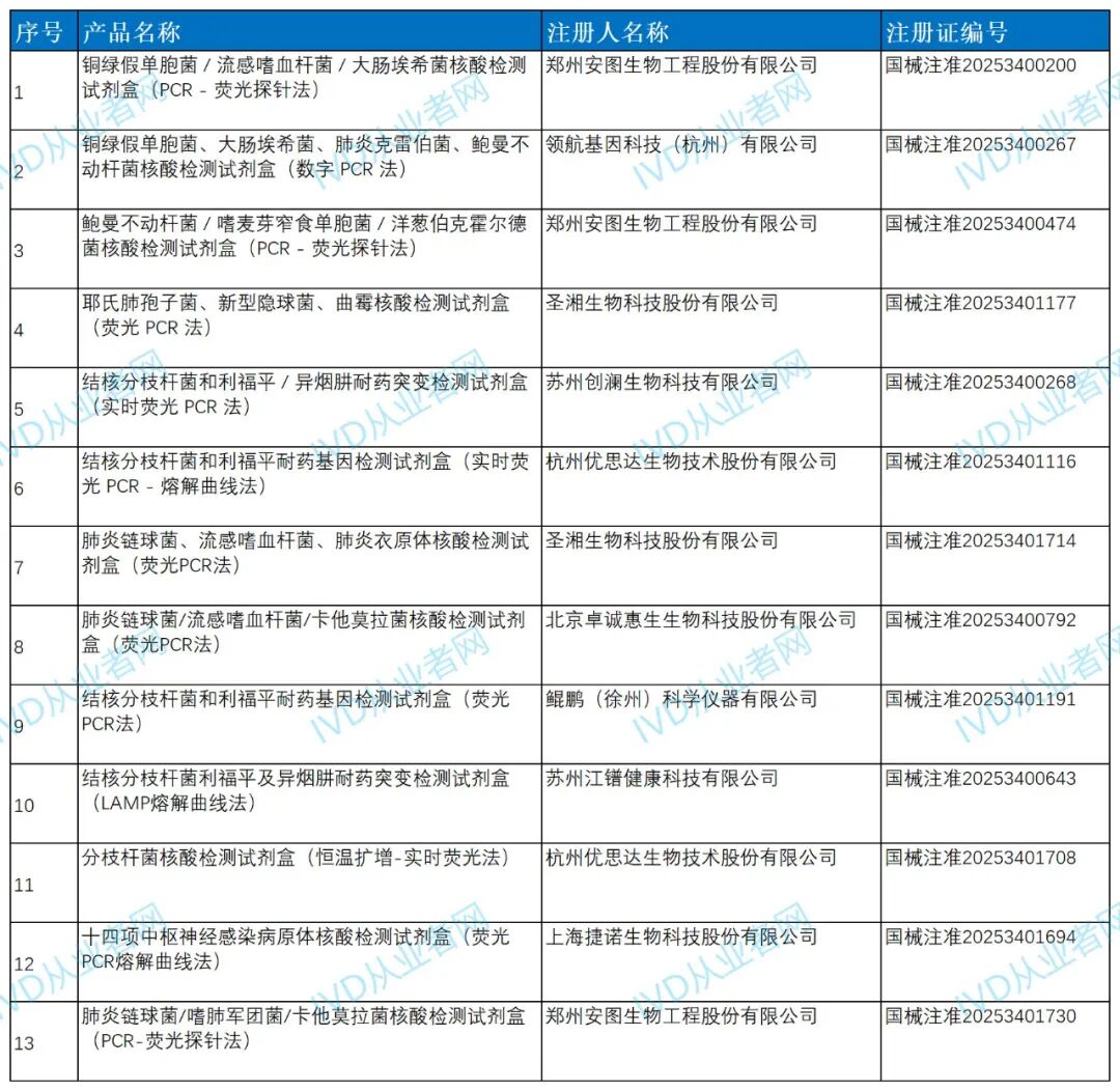 一、多联检产品数量爆发,呼吸道领域领跑从产品分布来看,呼吸道病原体检测仍是多联检的主战场。在43款已获证产品中,呼吸道板块独占20款,占比近半。其中既有传统的3联检(如甲流/乙流/呼吸道合胞病毒),也有覆盖16种病原体的超高通量产品(如厦门安普利、上海捷诺的16联检试剂盒)。 这类产品之所以备受青睐,源于呼吸道感染病原体多样、症状相似、临床鉴别诊断难度大。多联检试剂盒可在一次反应中完成多种病原体的筛查,极大提升了检测效率与诊断准确性。 二、技术路径多元,荧光PCR仍为主流从技术平台看,荧光PCR法仍是绝对主流,尤其是结合熔解曲线法、多重PCR等技术,实现了在同一反应体系中区分多个靶标。例如苏州协云基因的“十三项呼吸道病原体核酸检测试剂盒(多重熔解曲线法)”,正是通过熔解温度差异实现多靶标区分,体现了技术融合的优势。 此外,数字PCR、恒温扩增等新技术也开始在细菌真菌等领域试水,如领航基因的鲍曼不动杆菌等四联检产品就采用了数字PCR法,提升了检测的灵敏度和定量能力。 三、应用场景拓展,从呼吸道到全身感染除呼吸道外,多联检产品在胃肠道、性病、中枢神经感染、真菌鉴定等领域的应用也日益广泛。例如: