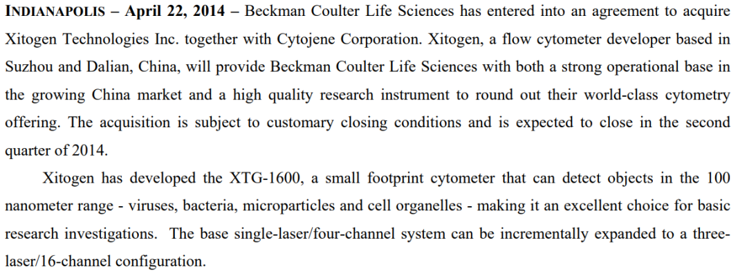 赛景公司成立于2011年,创始人陈永勤博士。2014年赛景生物被贝克曼库尔特公司收购。