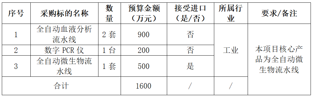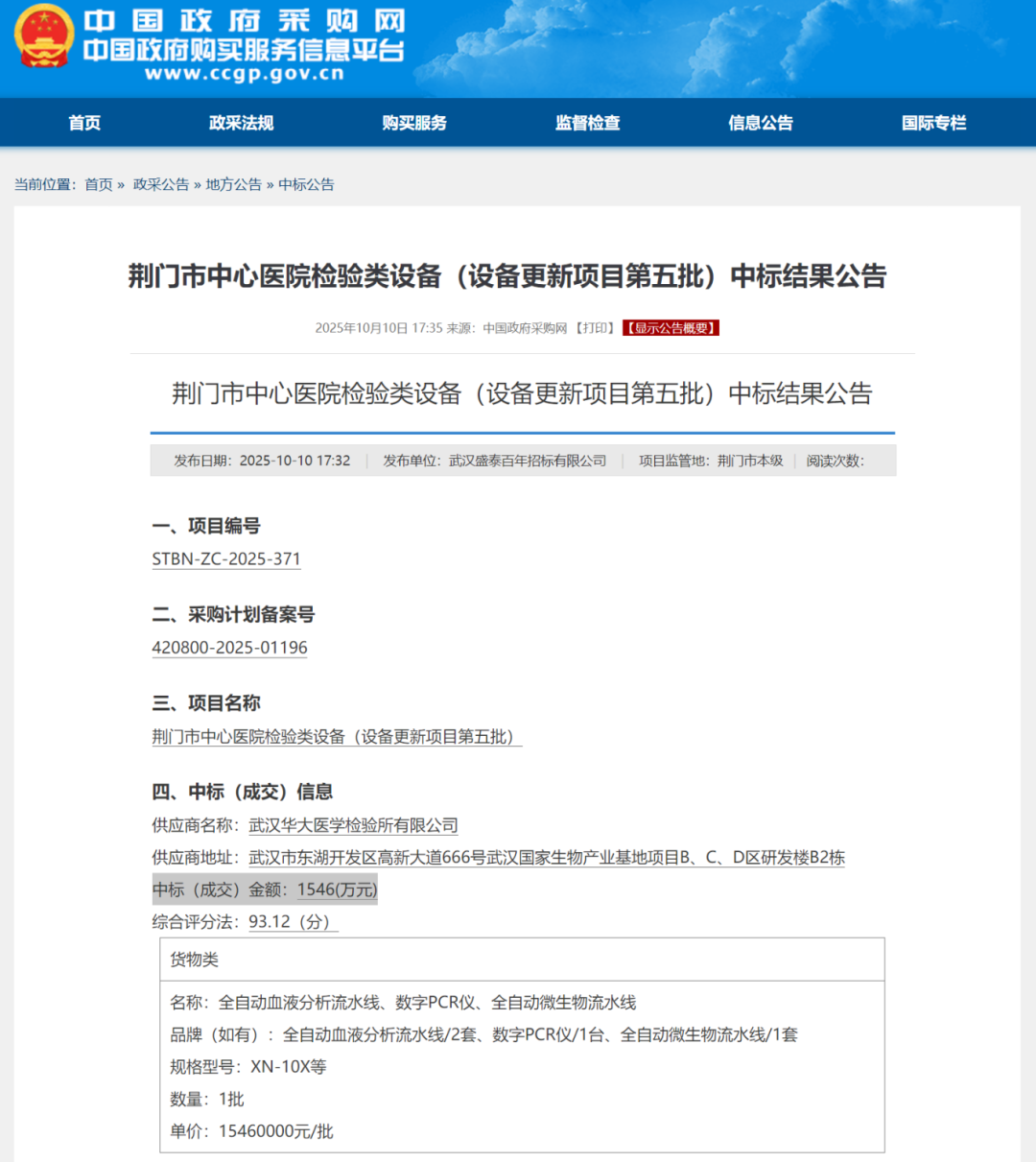 公告显示,武汉华大医学检验所有限公司成功中标,成交金额为1546万元。 涉及2套全自动血液分析流水线、1台数字PCR仪、1套全自动微生物流水线。 9月9日,该项目发布招标公告,项目总预算为1600万元,其中: 2套全自动血液分析流水线,预算900万元,不接受接口产品; 1台数字PCR仪,预算200万元,不接受进口产品; 1套全自动微生物流水线,预算500万元,接受采购进口产品。 据悉,武汉华大医学检验所有限公司成立于2012年2月,是华大股份在汉全资子公司,在东湖高新区建有数万平米的标准化实验室,拥有数百台国际顶尖测序仪和质谱仪,搭建数条自动化生产线,涵盖了从样本检测到提取,样本前处理和测序的全流程。 荆门市中心医院创建于1950年,现已发展成为一所集医疗急救、科研教学、预防保健等功能于一体的国家三级甲等综合医院,是全国抗击新冠肺炎疫情先进集体、全国院务公开示范医院、全国医疗服务满意先进单位、湖北省三级优秀医院。是荆楚理工学院附属荆门市中心医院、中国人民解放军总医院远程医学中心站点医院、国家卫生健康委指定的脑卒中高危人群筛查与干预项目基地医院、国家高级卒中中心、武汉科技大学和湖北医药学院研究生联合培养基地。作为荆门市区域医疗中心,承担着荆门市及毗邻地区260万城乡居民的医疗、预防保健任务。 |