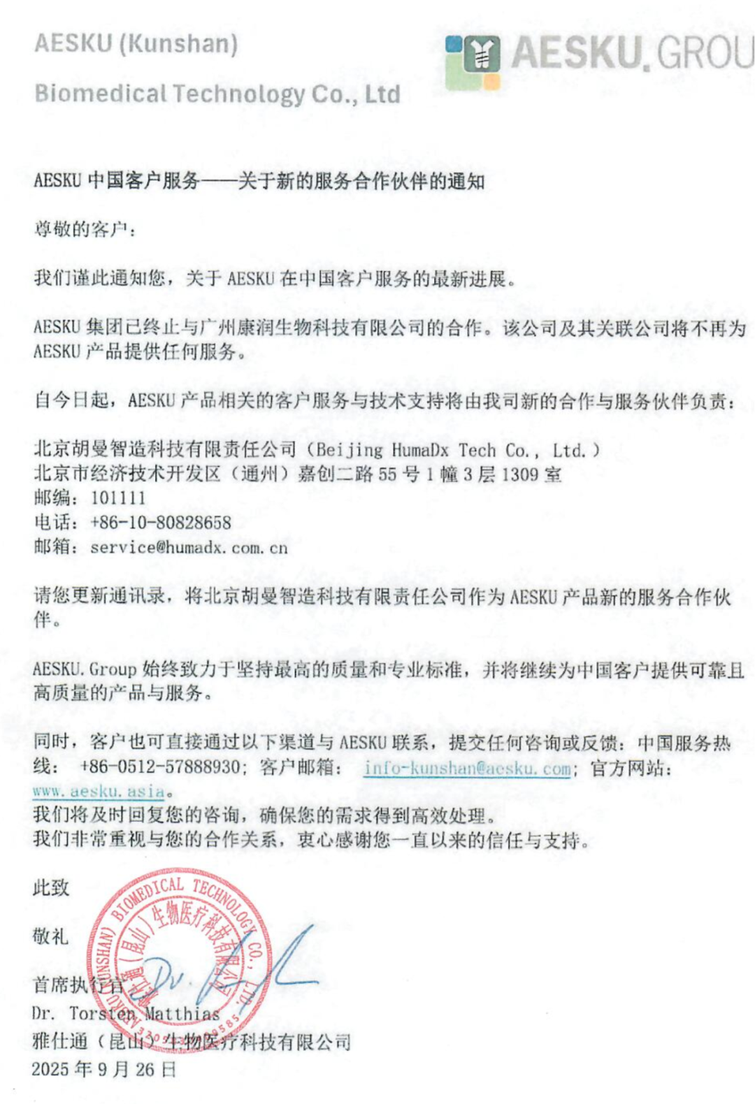 近日,全球知名自身免疫诊断企业AESKU公司宣布与北京胡曼智造科技有限公司(以下简称“胡曼智造”)达成战略合作,正式授权胡曼智造为其中国地区商业合作伙伴。与此同时,AESKU公司已终止与原合作方广州康润生物科技有限公司的合作关系。 此次合作标志着,未来AESKU在中国市场的产品推广、学术教育、销售布局及技术服务将由双方深度协同推进,共同为全国用户提供更专业、更高效、更精准的自身免疫检测解决方案。 AESKU公司进入中国市场20余年,凭借过硬的产品质量与领先的研发能力,在临床检验领域树立了良好口碑。目前AESKU在华可提供间接免疫荧光(IFA)与酶联免疫(ELISA)两大产品线,尤其是其创新的全自动IFA设备及试剂系统广受行业认可。 本次合作的一大核心亮点是双方将共同引入AESKU新一代全自动IFA平台——HELIOS HTC。 图1 HELIOS HTC自免智能检测新标杆 ✅ 全球唯一同时获得美国FDA、欧盟CE-IVDR、中国NMPA三重认证的全自动间接免疫设备 ✅ 覆盖样本加样—清洗—孵育—核型AI判读的全流程无人化操作 ✅ 智能判读系统可与ICAP国际间接免疫荧光标准图谱直接比对 ✅ 支持AI自动判定抗体滴度,无需多次稀释,节约人工与试剂成本 该设备目前已在中国近百家、全球数千家实验室稳定运行,多项国际研究验证其AI判读准确性极高,堪称人工智能技术与自身抗体检测融合的标杆产品。 胡曼智造:深耕本土 · 创新赋能 胡曼智造团队在中国自身免疫检测领域深耕近20年,不仅具备深厚的临床理解力与市场执行力,还拥有 ✅ 覆盖全国的渠道布局与专家资源连接能力 ✅ 自主研发的流式荧光与免疫印迹自身抗体产品(已获NMPA认证) ✅ 面向医院及独立医学实验室的完整自身抗体检测解决方案 优势协同 · 1 + 1 > 2 维度 优势协同后的能力 产品线 德国AESKU进口IFA & ELISA + 胡曼智造国产流式/印迹,覆盖全方位自身抗体检测场景 技术 与服务 AESKU德国科学家/产品专家 + 胡曼智造本地售后与技术支持,服务更快更专业 学术推广 双方将联合开展全国性学术巡讲与实验室教育培训,助力自身抗体检测标准化建立 展望未来 AESKU高度重视此次合作,已正式出具合作伙伴通知,全力支持胡曼智造在中国市场的市场拓展。未来,双方将携手在AI智能判读、自身抗体检测标准化、学术生态共建等方向深度合作,共同推动自身免疫诊断技术的高质量发展。 AESKU目前已经NMPA批准的产品清单 01 仪器清单 02 间接免疫荧光试剂清单 03 酶联免疫试剂清单 关于AESKU AESKU成立于2000年,总部位于德国Wendelsheim,在德国和美国均有体外诊断产品的生产基地。成立25年来,AESKU公司致力于以自身抗体检测试剂为核心的体外诊断试剂研发及生产,目前可以提供近千种检测试剂盒,产品广泛销售于全球90余个国家。 关于胡曼智造 胡曼智造是一家集研发、生产、销售于一体的医疗技术创新公司,公司凭借多年的材料学、体外诊断技术和市场营销经验的积累,基于多重流式荧光技术这一核心,致力于为临床客户提供全自动、高通量、极具竞争优势的全自动多重流式荧光检测平台及配套试剂,聚焦于重大免疫疾病、疑难杂症及罕见病的诊断,同时积极拓展体外诊断领域的新兴蓝海市场。 |