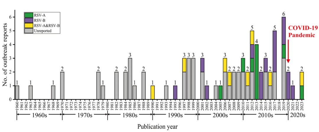 研究共纳入72篇文献的82起RSV疫情暴发事件,累计2282例病例。随时间推移,RSV疫情暴发总体走高,尤其是近二十年间增加显著,2019年达峰值(6 起)。