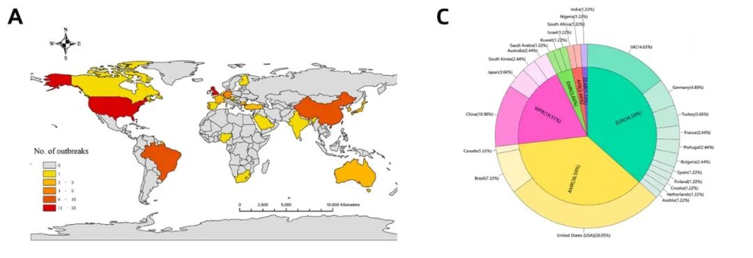 全球有25国报告RSV疫情,以美国(23例)、英国(12例)、中国(9例)次数最多;其余国家分别为巴西、德国、日本、土耳其、保加利亚、法国、韩国、澳大利亚、葡萄牙、科威特、印度等。按WHO区域划分,欧洲和美洲区域发生率最高(36.59%)。