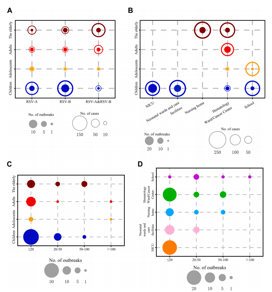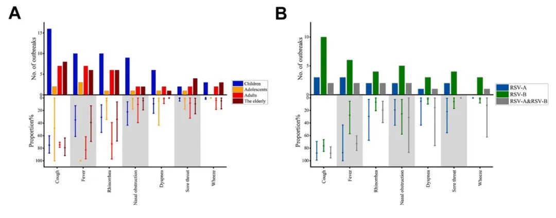 82起疫情的中位规模13例。RSV-B更易在儿童感染,而RSV-A/B混合感染在老年人中病例更多。青少年和成人疫情较少,但易在人口密集场所如学校和军营爆发大规模疫情。