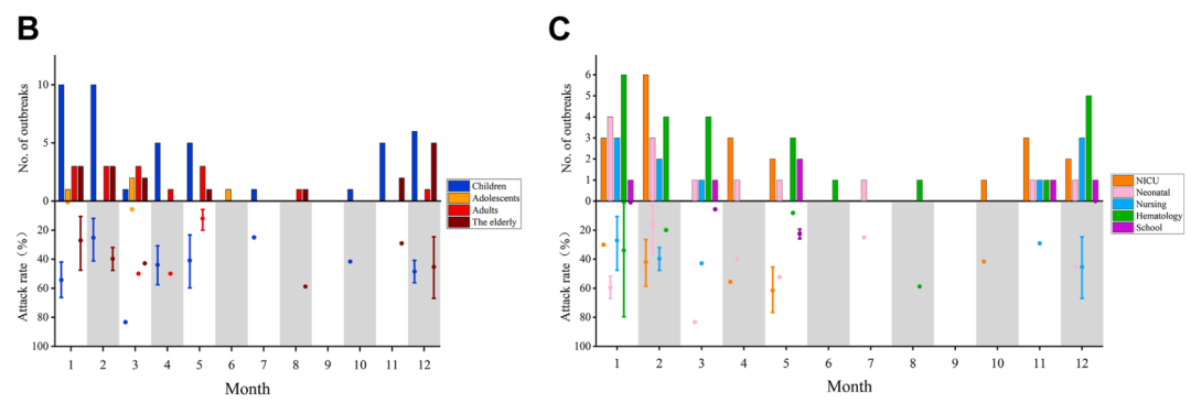 血液科/肿瘤中心暴发25起,数量最高,占比30.49%,其次为新生儿重症监护室(24.39%)、新生儿病房及护理机构(15.85%)、养老院(12.20%)、学校(7.32%)、军营(1.22%)及其他场所(包括空军新兵训练营、普通成人病房和普通儿科病房)(8.54%)。