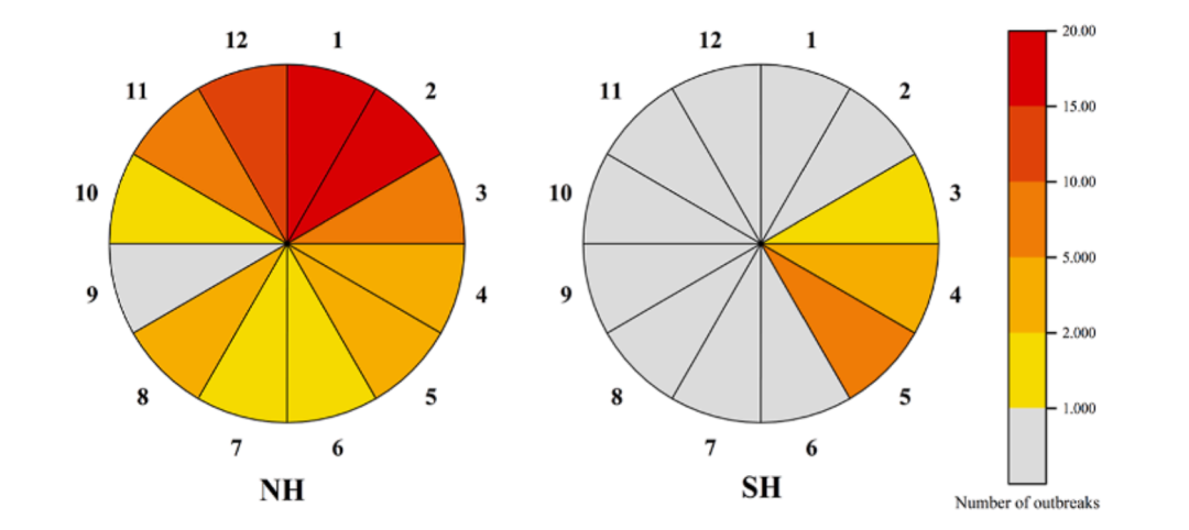 64.63%的RSV疫情发生在冬季, 其次是春季(17.07%)、 秋季(13.41%)和夏季(4.88%)。具体而言,北半球RSV疫情主要集中在12月至次年2月,而南半球则多发于3月至5月。