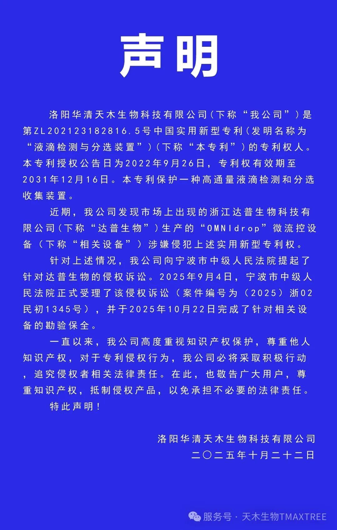 | 近日,中国生物科技圈掀起一场轩然大波。两家在液滴微流控领域颇具影响力的企业——洛阳华清天木生物科技有限公司(下称“天木生物”)与浙江达普生物科技有限公司(下称“达普生物”)——因一项实用新型专利对簿公堂,并接连发布措辞严厉的公开声明,引发行业内外高度关注。1. 天木生物率先“亮剑”:指控侵权,法院已受理并证据保全10月22日,天木生物率先发布《声明》,称其是专利“ZL202123182816.5——液滴检测与分选装置”的专利权人,并直指达普生物生产的“OMNIdrop”微流控设备涉嫌侵犯该专利权。声明透露,天木生物已就此向宁波市中级人民法院提起侵权诉讼,法院已于2025年9月4日正式立案(案号:(2025)浙02民初1345号),并于10月22日完成了对涉嫌侵权设备的现场勘验保全。这一程序意味着法院已固定关键证据,为后续技术比对和侵权认定奠定了基础。天木生物在声明中态度坚决,表示“必将采取积极行动,追究侵权者相关法律责任”,并呼吁用户“尊重知识产权,抵制侵权产品”。2. 达普生物强势“反击”:专利无效已提起,指控为滥用诉权面对指控,达普生物在10月23日迅速发布《严正声明》予以回击,内容信息量巨大,火药味十足。核心反击点一:专利根基不稳。 达普生物透露,早在天木生物发布声明前(9月29日),其已就涉案专利向国家知识产权局提起了无效宣告请求。声明中强调,涉案专利为“仅经过形式审查”的实用新型专利,并直指其“不符合《专利法》第26条第3款”,暗示该专利本身存在致命缺陷,权利稳定性存疑。达普生物质疑天木生物在明知专利面临无效挑战的情况下,仍发布“侵权声明”的动机。核心反击点二:诉讼不等于侵权。 达普生物指出,天木生物的诉讼仅是“单方主张”,证据保全也仅是“程序性措施”,不具备证明侵权成立的效力。其认为对方的指控“缺乏事实支撑”,意在误导公众。核心反击点三:技术路径不同,坚持自主创新。 达普生物宣称其技术为“独立自主研究成果”,与天木生物的专利“存在显著差异”,并列举了公司已获和已申请超40项专利、获得多项荣誉等,以证明自身强大的研发实力,否认侵权。核心反击点四:指控对方滥用专利权。 达普生物将天木生物的行为定性为“以‘维权’为名、行‘滥用专利权’之实”,是干扰市场公平竞争秩序的“恶意行为”,并表示将“积极应对”、“保留追责权利”。这场纠纷发生在高技术壁垒的微流控领域,该技术是生命科学、临床诊断等领域的关键平台技术,市场前景广阔。两家公司的正面冲突,因此被视作行业竞争白热化的一个标志性事件。法律专家分析,本案的走向将取决于两个平行程序的結果:国家知识产权局的专利无效审查结果: 如果天木生物的专利被宣告无效,侵权诉讼将失去权利基础,天木生物或将面临败诉。宁波市中级人民法院的侵权审理结果: 如果专利被维持有效,法院将进行细致的技术特征比对,以判断达普生物的产品是否落入专利保护范围。无论最终结果如何,此事件都已为所有科技企业敲响警钟:在激烈市场竞争中,知识产权既是护城河,也是武器库。如何布局高质量专利、如何应对专利挑战、如何在进行技术创新的同时规避侵权风险,成为企业必须修炼的内功。目前,这场“罗生门”式的纠纷刚刚拉开序幕,双方均已摆出决战姿态。天木生物能否凭借法律武器成功“维权”?达普生物又能否凭借专利无效程序和技术自主证明“清白”?这一切,都有待时间和司法的裁决。但可以肯定的是,这场大战的结局,必将对中国生物科技领域的创新与竞争生态产生深远影响。