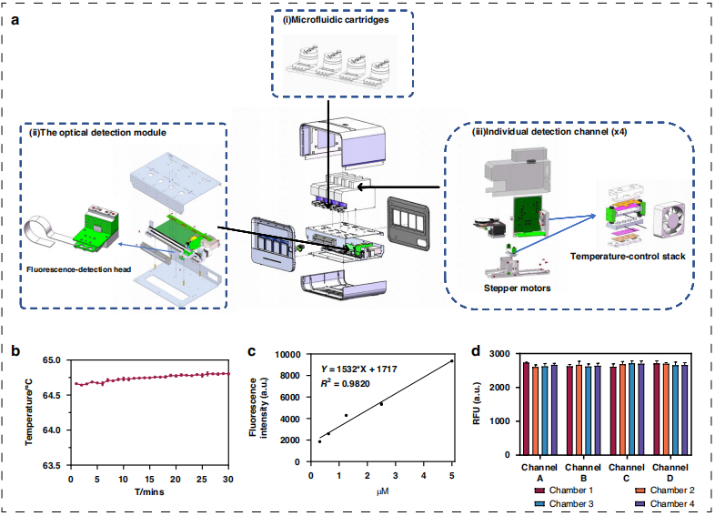 呼吸道感染(RTIs)是全球发病率和死亡率的主要诱因之一。季节性流感、肺炎支原体(MP)、SARS-CoV-2等病原体常同时流行,其临床症状重叠且难以区分,早期精准诊断对指导临床治疗和公共卫生应对至关重要。因此,迫切需要高通量、多病原体检测,通过快速识别大量患者群体中的致病病原体,减轻医院和实验室的压力。目前主流检测技术如RT-qPCR虽具高灵敏度和特异性,但依赖实验室设施。等温核酸扩增技术如环介导等温扩增(LAMP)无需热循环约束且保留高分析灵敏度,但其应用受限于引物设计复杂性及多重检测中交叉引物干扰等问题。微流控技术将样品制备、扩增与检测集成于微型自动化平台,为呼吸道病原体诊断提供了新思路。然而,现有微流控设备仍存在几个局限:(1)通量受限;(2)手动驱动或复杂离心结构;(3)系统集成度低,易导至污染。 近日,杂志Microsystems & Nanoengineering上发表了一篇题为“A fully automated rotary microfluidic platform for high-throughput multiplex detection of respiratory tract pathogens”的文章。作者开发了一种全自动旋转微流控平台(FA-RMP),用于高通量多重呼吸道病原体检测。FA-RMP能够在30分钟内并行处理16个独立的反应,支持同时检测多达4个不同的临床样品。该平台可在30分钟内检测出50拷贝/μL的肺炎支原体DNA,同时支持3种病原体的检测,为临床呼吸道病原体的多重诊断提供了一种很有前景的工具。 图片来源:Microsystems & Nanoengineering 主要内容 FA-RMP整合微流控芯片、光学检测模块及四通道温控系统,整体尺寸为340mm × 255mm × 230mm,重量小于9kg,适用于POCT场景。FA-RMP将温度控制和荧光信号检测集成到全自动工作流程中,能够同时处理多达四个单独的检测通道,从而实现高通量诊断。微流控卡盒采用旋转驱动结构,集成样本裂解、试剂混合与液体分配功能。通过电机驱动转子旋转,控制液体在裂解室、样本加载室与混合室间定向流动,最终将裂解后样本导入预装冻干LAMP试剂的反应室。FA-RMP可在~ 30min内自动完成核酸释放、等温扩增、实时荧光检测等检测过程。 全自动旋转微流控平台(FA-RMP)概述 图片来源:Microsystems & Nanoengineering 作者优化了LAMP反应内引物(FIP/BIP)、外引物(F3/B3)及环状引物浓度,最终确定了内引物20μM(图a)、外引物5μM(图b)、环状引物10μM(图c)。优化Mg2+浓度为4 mM,以平衡扩增效率与非特异性信号抑制(图d)。 LAMP反应体系优化 图片来源:Microsystems & Nanoengineering 利用MP标准培养物,作者研究了FA-RMP的敏感性和特异性。结果显示,FA-RMP对MP-DNA的检测限低至50 copies/μL(图a),在5000–50 copies/μL范围内,阈值时间(Tp)与模板浓度对数呈线性相关(R² = 0.9528),说明FA-RMP具有很好的定量能力(图b)。在8种非目标呼吸道病原体(流感A/B、呼吸道合胞病毒等)检测中均无交叉反应,证明其具有高特异性(图c)。 FA-RMP敏感性、特异性研究 图片来源:Microsystems & Nanoengineering 通过甲型流感、乙型流感和肺炎支原体(MP)的临床样本,作者评估了该系统同时检测多种呼吸道病原体的能力。临床样品经核酸释放试剂预处理后加入微流控卡盒。结果显示,已知的甲型流感、乙型流感和MP样本都在适当的腔室中特异性检测,没有交叉信号(如下图)。这证明了该分析对临床标本的适用性及其在芯片上多重目标的能力。 病原体的多重检测 图片来源:Microsystems & Nanoengineering 作者开发了一种全自动旋转微流控平台(FA-RMP),用于高通量多重呼吸道病原体检测。FA-RMP通过微流控技术、冻干试剂与自动化系统的融合,实现了呼吸道病原体的高通量、快速以及多重检测。FA-RMP具有30分钟内完成4样本并行检测的能力,可达到50 copies/μL的检测限与100%特异性,适用于资源有限环境中多重呼吸道病原体的同步筛查需求。 但尽管FA-RMP在鼻咽拭子检测中表现优异,但对高粘度样本(如痰液)的适用性尚未验证。未来需扩展复杂样本类型测试,并进一步增加临床样本规模及病原体覆盖范围。同时,平台实时荧光采集与模块化腔室结构为未来集成定量分析及数字LAMP提供基础。通过结合多重等温扩增方法与其他病原体引物,可进一步扩展其应用场景。 |
