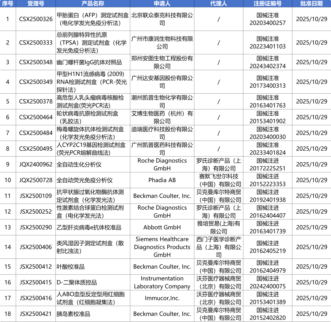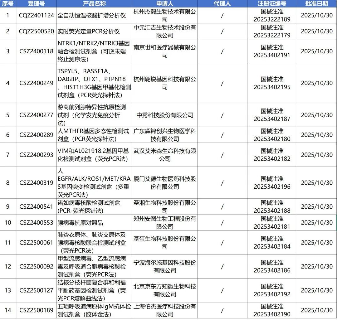 11月3日,国家药监局审批通过了139个医疗器械,其中有14个IVD新产品获批上市,18个IVD产品变更注册,1个IVD产品延续注册。