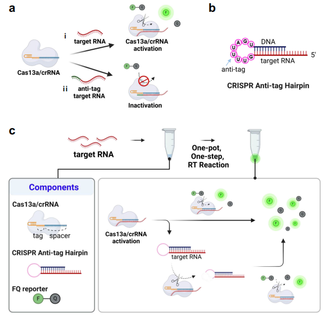 在传统CRISPR/Cas13a激活反应中,Cas13a内切酶和crRNA形成功能性RNP复合物,结合与crRNA间隔区序列互补的RNA靶标。然而,当目标RNA含有anti-tag序列时,Cas13a RNP的构象变化被抑制,将会阻碍其反式切割活性的激活(图a)。作者设计了一种特殊的发夹结构RNA,称为"CRISPR anti-tag hairpin"。此结构包含anti-tag序列和一个具有不对称长度的DNA和目标RNA双链嵌合区域,其中目标RNA区域与crRNA完全互补(图b)。虽然含有目标RNA序列,但由于发夹结构和anti-tag的存在而无法激活Cas13a;但在目标RNA存在的情况下,Cas13a被激活并启动反式切割反应,导至anti-tag序列被切割,暴露发夹内部的目标RNA序列,使其能够被Cas13a/crRNA复合物识别,进一步激活Cas13a的反式切割活性,从而实现级联信号放大(图c)。