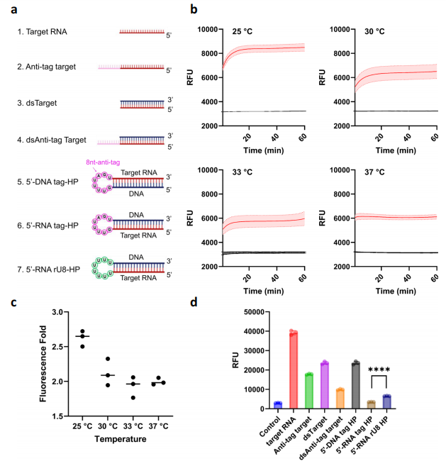 作者在多种反应温度下测试了CARRD体外反式切割实验。结果显示,本实验CRISPR/Cas13a系统在25°C下的反应效率比37°C更高。作者还构建了将anti-tag序列整合到环区中的发夹结构,并比较其反式切割活性。在这种构型中,anti-tag序列被定位在目标RNA的3'和5'末端,分别为‌5'-DNA tag-HP和‌5'-RNA tag-HP‌,结果表明,5'-RNA tag-HP表现出显著降低的信号,表明RNA的3'端环结构对Cas13a的反式切割活性具有显著的抑制作用(图d)。