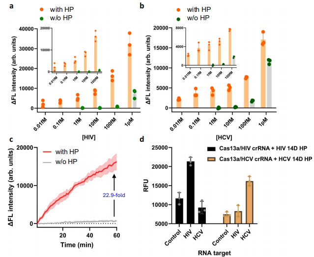 在优化条件下,作者研究了HIV RNA的CARRD法检测。结果表明,与不添加14D HP的常规Cas13a/HIV crRNA反应相比,添加HIV 14D HP的CARRD法检测灵敏度显著提高,检出限 (LOD)为10 aM,比常规Cas13a/crRNA反应灵敏度提高了10000倍(图a)。作者还将CARRD检测应用于丙型肝炎病毒(HCV)RNA的检测,优化结果显示,CARRD检测对HCV RNA的检测限也达到了10 aM,验证了CARRD检测的技术通用性。