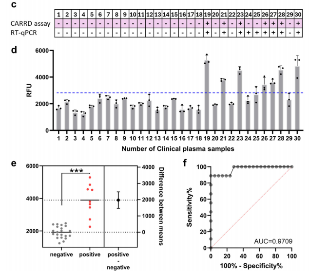 作者应用CARRD法分析HIV临床血浆样本,验证其临床可行性。共入组30个临床血浆样本并提取其RNA,RT-qPCR确认9个HIV阳性和21个阴性。将RT-qPCR结果与CARRD检测结果进行比较发现,除样品24和25外,所有结果均吻合(下图 c)。检测的灵敏度为77.8%,特异性为100%,总体准确率为93.3%,阳性预测值(PPV)为100%,阴性预测值(NPV)为91.3%。受试者工作特征(ROC)曲线的AUC为0.9709,表明具有优异的诊断性能(图f)。