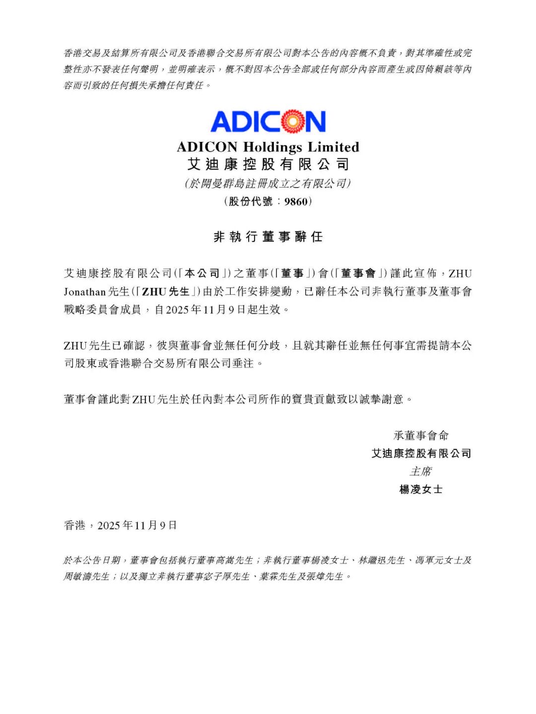 11月9日,艾迪康公告。公司董事会谨此宣布,ZHU Jonathan 先生由于工作安排变动,已辞任本公司非执行董事及董事会战略委员会成员,自 2025 年 11 月 9 日起生效。