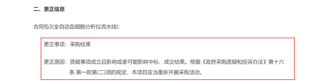 9月11日,该项目发布结果更正公告。公告指出,合同包3(全自动血细胞分析仪流水线)的采购结果作废,项目重新招标。