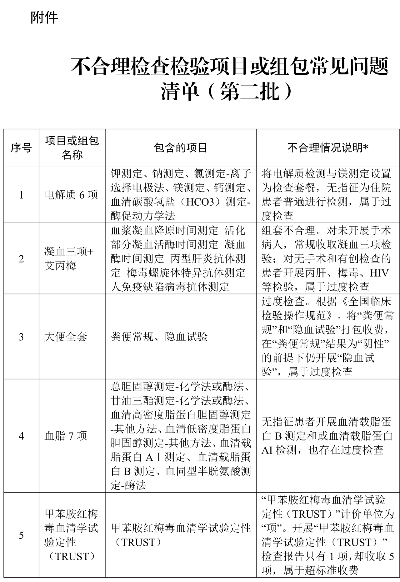 广东省卫生健康委收集了各地抽查发现的高频不合理检验项目或组包、项目数量超过7项的组包,并组织专家对频次超过1000的不合理检验项目或组套清单进行分析,形成了问题清单(第二批)。