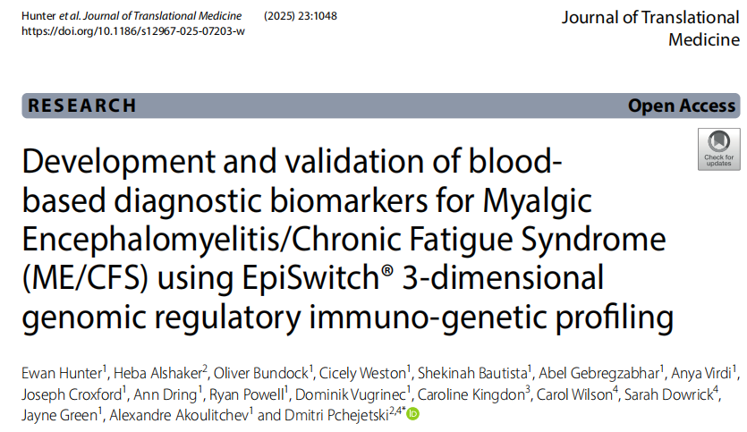 摘要: 本研究基于EpiSwitch®三维基因组调控免疫遗传分析技术,通过全基因组染色体构象(CCs)筛选,确定了一个200个标记的ME/CFS诊断模型(Episwitch®CFS测试),灵敏度为92%,特异性为98%。 ...