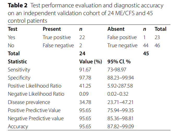 在独立验证队列中,Episwitch®CFS测试显示出优异的诊断性能(如下图):灵敏度达92%,特异性达98%,总体准确率为96%。阳性似然比为41.25,疾病预测阳性值和阴性预测值均达到95.65%。这些CC标志物广泛分布于多个染色体区域,表明ME/CFS可能涉及基因组区域的复杂相互作用,而不是单一的失调位点。