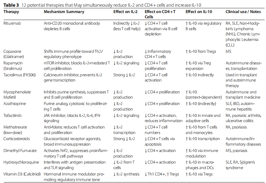 作者通过文献分析筛选出12种可能同时降低IL-2和CD4+细胞并增加IL-10的潜在疗法。这些疗法包括:利妥昔单抗(通过B细胞耗竭间接抑制IL-2)、格拉替雷(通过向Th2/调节表型转变免疫特征)、雷帕霉素(通过mTOR抑制阻断IL-2介导的T细胞增殖)、托法替尼(JAK抑制剂,阻断IL-2信号传导)等(如下表)。尽管并非所有 12 种疗法都已在ME/CFS中进行过试验,但其中许多疗法的作用机制与观察到的免疫功能障碍相吻合。未来的研究应侧重于低剂量、精准的免疫调节,并密切关注免疫监测、感染风险以及亚组分层。