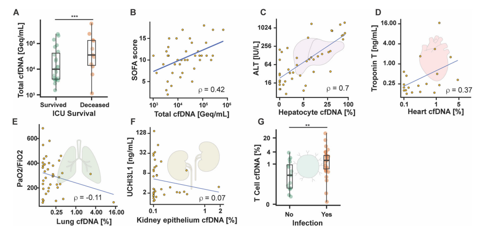 重症监护病房中,器官损伤和感染是导至患者死亡的主要原因。这两种病理过程都会向血液循环中释放游离DNA。受损组织释放的DNA片段保留着甲基化标记,可用于推断组织来源;而在感染存在时,病原体则会贡献微生物cfDNA。