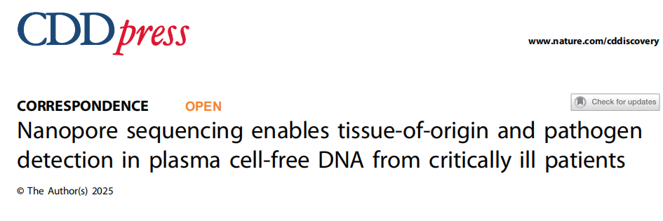 近日,比利时安特卫普大学在杂志Cell death discovery上发表了一篇题为“Nanopore sequencing enables tissue-of-origin and pathogen detection in plasma cell-free DNA from critically ill patients”的correspondence。本研究首次报道了采用牛津纳米孔技术低覆盖度测序方案,在单次检测中同时捕获组织损伤和病原体信号。测序中位覆盖度约为0.8X,观察到具有生物学一致性的组织信号和病例水平的微生物一致性。这一技术平台有望革新危重患者的诊疗模式,通过无创检测同时监测多器官损伤和感染状态,为精准医疗在重症医学领域的应用开辟新的可能性。
