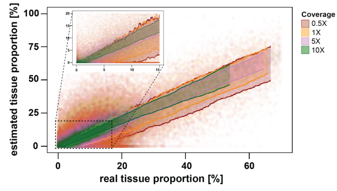 不同覆盖度下模拟cfDNA混合物的去卷积