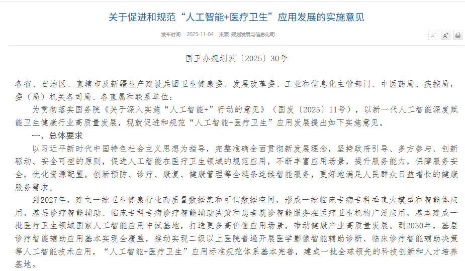 近日,国家卫健委等五部门联合印发的《关于促进和规范“人工智能+医疗卫生”应用发展的实施意见》正式公布。这份被业内称为“AI医疗施工图”的政策文件,提出了2027年与2030年的两阶段发展目标,明确了八大方向24项重点任务,为医疗健康领域的数智化转型划定了清晰路径。