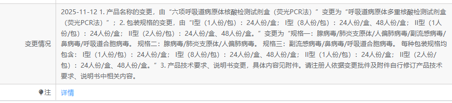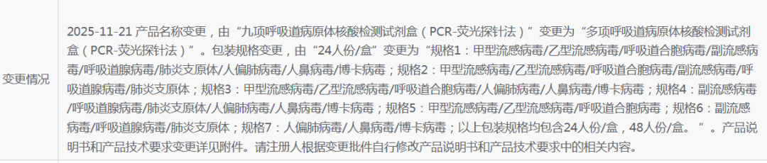由“九项呼吸道病原体核酸检测试剂盒(PCR-荧光探针法)”变更为“多项呼吸道病原体核酸检测试剂盒(PCR-荧光探针法)”。