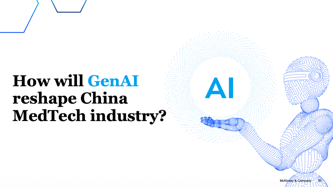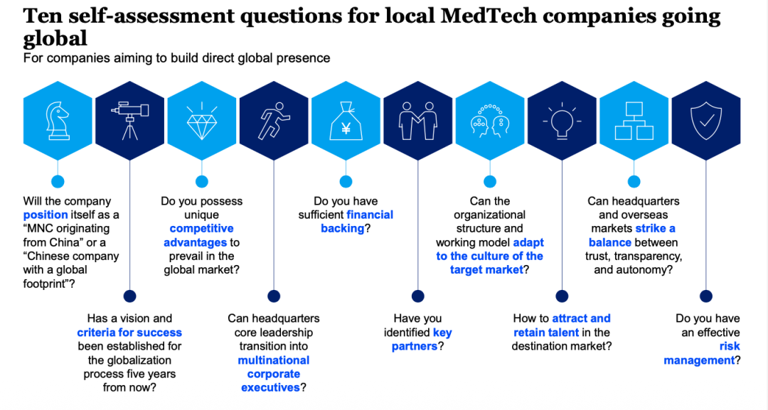 三、中国创新:能否复制生物技术的成功路径? 中国在电子、电动汽车和生物技术等多个行业都已证明了由本土创新驱动的成功。中国生物技术的发展路径尤为引人注目:本土创新正走向全球,正转向下一代治疗模式,并且研发周期更快,平均药物发现到IND提交的时间比全球平均水平快50%-70%。 医疗器械创新生态的独特优势 驱动中国创新的六个差异化因素为医疗器械行业提供了强大的基础: 1. 集成价值链:拥有所有主要工业类别,实现快速问题解决。 2. 临近工厂:靠近制造中心,支持快速原型制作和实时测试。 3. 数字化加速:硬件-软件-AI-算法协同创新,缩短原型制作并高效规模化创新(占全球AI专利的60%+)。 4. 创业家精神:绩效驱动的文化,赋能企业以“中国速度”快速试验和迭代。 5. 敏捷运营模式:跨职能团队加速决策和开发周期(例如,中国电动汽车研发周期<3年,而全球平均为5-6年)。 6. 熟练人才库:软件和工程人才(2024年约600万STEM毕业生)的多元化人才库。 中国医疗器械创新差距正在迅速缩小,主要体现在以下三种类型: 1. 快速追随者(Fast followers):在MNCs推出前沿创新后不久,迅速在中国实现商业化。 2. 为本地需求做更优(Me-better for local needs):针对中国市场需求对全球创新进行增量改进或调整。 3. 突破性创新者(Breakthrough innovators):带来变革性的创新技术,提升全球治疗标准。例如,NMPA自2019年以来已批准了120+款AI医疗设备。中国已成为亚洲医疗器械创新的主要来源。 四、本土企业的全球雄心:崛起之路与自我评估 本土企业正在迅速发展,但与全球顶尖公司在规模上仍存在差距。2024年,全球前十大医疗器械公司的平均营收为260亿美元,而中国前十大公司的平均营收为16亿美元。然而,中国公司的增长速度更快,2019-2024年CAGR为13%(全球为5%)。此外,营收超过10亿美元的中国医疗器械公司数量已从2019年的3家增加到2024年的8家。 1. 全球化加速与增长引擎 在过去五年中,本土企业的全球化进程显著加速。海外市场已成为领先中国医疗器械公司的关键增长引擎。 • IVD和设备(Equipment) 细分市场在海外市场实现了最高的营收CAGR,分别为26%和17%。 • 海外营收占比提升:排名前30的本土医疗器械公司海外营收占比在2024年相比2019年均有所提高,除消费器械领域保持稳定外。 2. 本土企业走向全球的十个自评问题 对于寻求建立直接全球业务的本土医疗器械公司,报告提出了十个核心自评问题,以指导其全球化进程: 1. 公司的定位是“源自中国的MNC”还是“具有全球足迹的中国公司”? 2. 是否具备在国际市场胜出的独特竞争优势? 3. 是否为未来五年的全球化进程设定了愿景和成功标准? 4. 是否拥有足够的财务支持? 5. 总部核心领导层能否过渡为跨国企业高管? 6. 组织架构和运营模式能否适应目标市场的文化? 7. 是否已确定关键合作伙伴? 8. 总部与海外市场能否在信任、透明度和自治权之间取得平衡? 9. 如何在目标市场吸引和留住人才? 10. 是否具备有效的风险管理机制? 五、数字化与GenAI:重塑产业的驱动力 数字化在医疗器械行业涵盖三个关键“战场”:企业核心生产力、消费者和HCP(医疗保健专业人员)体验提升、以及新产品开发。目前,中国医疗器械企业在数字化领域大多处于“观望”状态,只有少数消费医疗企业积极探索,主要聚焦于“新产品开发”领域。 而生成式AI(GenAI)正成为全球医疗器械行业关注的焦点。全球范围内,约60%的公司是“热情的创新者(Enthusiastic innovators)”,尝试在各个业务领域应用GenAI;约40%的公司是“专注的变革者(Focused transformers)”,集中资源在某一特定业务领域寻求财务效益。 最常实施的GenAI用例集中在: