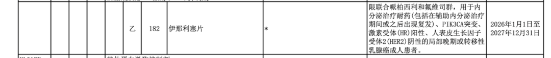 新版目录纳入了两款今年刚获批上市的新药,均为乙类报销:- 伊那利塞(罗氏):限联合哌柏西利和氟维司群,用于内分泌治疗耐药(包括在辅助内分泌治疗期间或之后出现复发)、PIK3CA突变、激素受体(HR)阳性、人表皮生长因子受体2(HER2)阴性的局部晚期或转移性乳腺癌成人患者