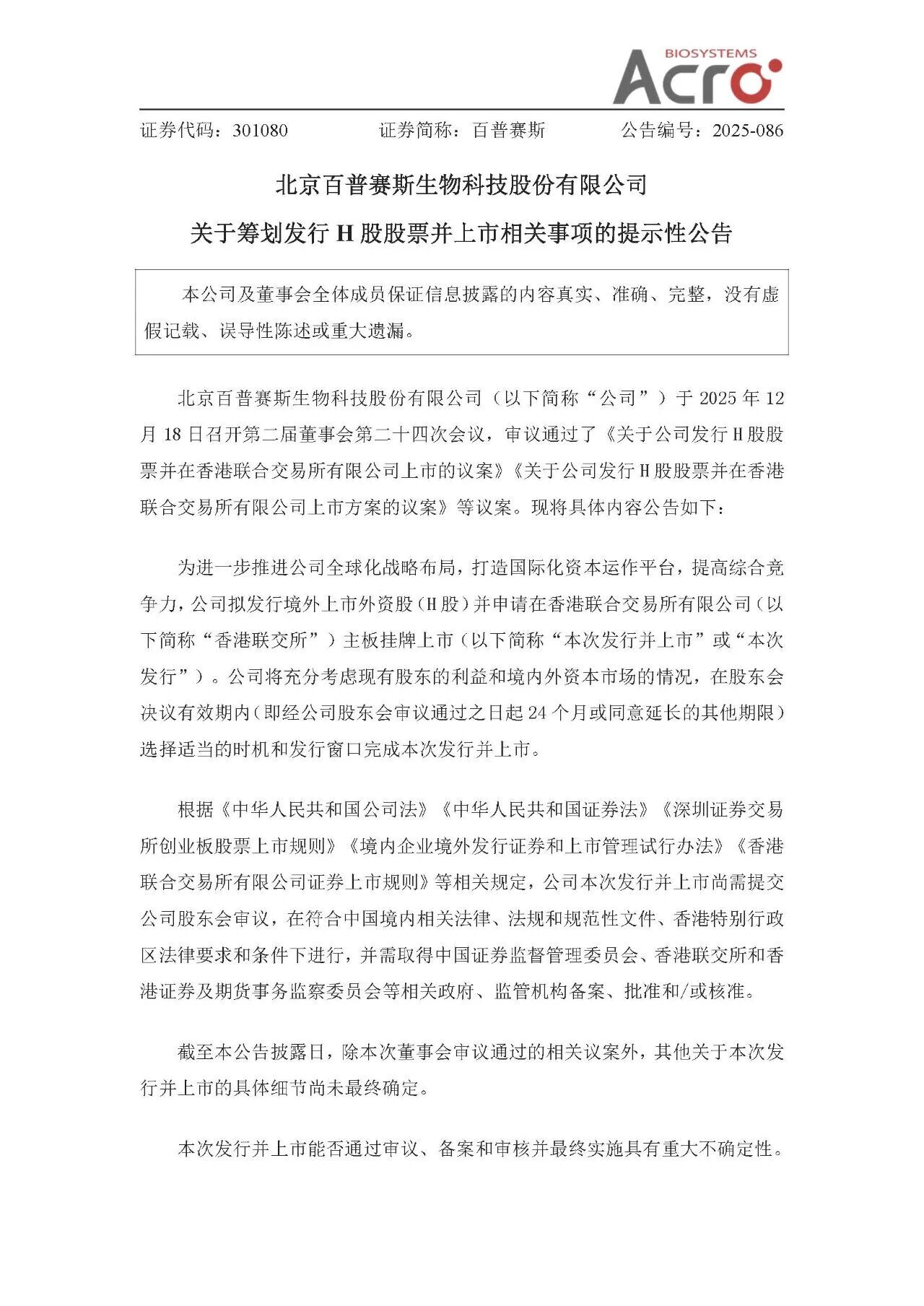 12月18日,百普赛斯发布公告,公司于2025年12月18日召开第二届董事会第二十四次会议,审议通过了发行H股股票并在香港联交所主板挂牌上市的议案。公司拟发行境外上市外资股(H股),并申请在香港联交所主板挂牌上市,以进一步推进公司全球化战略布局,打造国际化资本运作平台,提高综合竞争力。本次发行并上市尚需提交公司股东会审议,并取得相关政府、监管机构备案、批准和/或核准。截至公告披露日,具体细节尚未最终确定。