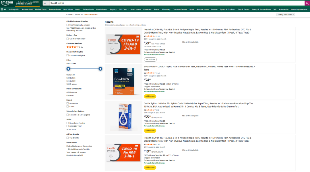 3. 季节性爆发带来的超额利润 流感市场的特殊性在于其季节性爆发的特点。在流感高峰期,市场需求会瞬间激增数倍,导至供不应求。此时,企业议价能力最强,往往能获得超额利润。对于生产企业而言,如何平衡产能和库存是关键,而成功押注爆发季的企业将收获颇丰。 市场利润并非空穴来风,真实的电商销售数据印证了消费者和市场对多重联检试剂的巨大需求。小编截取了2025年12月亚马逊美国站“流感 A&B 检测盒”的搜索结果页面,可以清晰地看到几个核心趋势: