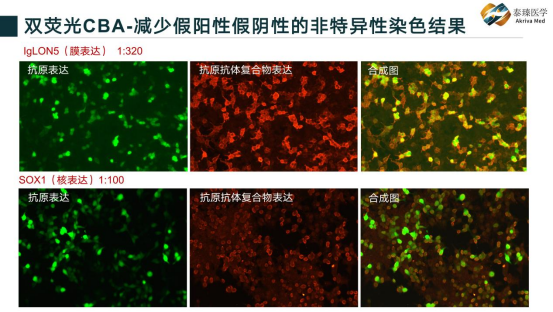 PTBA(Peripheral Nerve-TBA),专门制备鼠周围神经组织切片作为抗原底物,针对性检测样本中是否含有针对周围神经抗原的自身抗体,解决传统周围神经抗体检出率过低,检测平台不足的问题,能高效筛查针对神经纤维、髓鞘、郎飞结等抗原的抗体,为临床进一步提供相关免疫学证据。 第二,CBA金标准,三大创新优化 CBA技术双色荧光内参对照,排除非特异性染色。