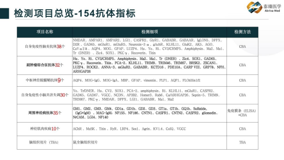 第四,试剂和体系完整 不断丰富的抗体体系,60+组套试剂盒,涵盖上述的神经免疫性疾病,血清/脑脊液单样本或双样本,CBA和/或TBA。小/中/大各种组合。 有专业人员帮助做出套餐选择。