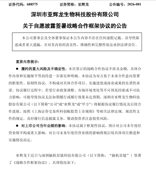 2026年1月6日下午,亚辉龙股价开盘后异动拉升,最终收盘上涨6.52%,成交量较上一交易日激增299%,1月7日继续维持这种增势,这一切是源自其宣布与深圳脑机星链科技有限公司签署《战略合作框架协议》。